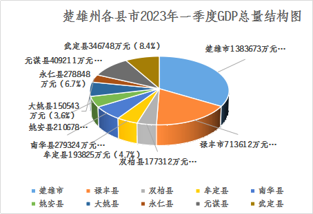 1.从总量看:2023年一季度,楚雄市实现地区生产总值138.37亿元,占全州总量414.38亿元的33.4%;和上年同期相比,总量增加了7.07亿元,在全州总量中的占比则下降了1.1个百分点。