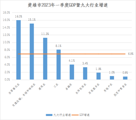 1.从构成GDP的九大行业看:有4个行业增加值增速超过了GDP整体平均增速,5个行业增加值增速超低于GDP整体平均增速。其中,住宿餐饮业增速最高,为16%;批发和零售业增速最低,为0.9%,极差为15.1个百分点。