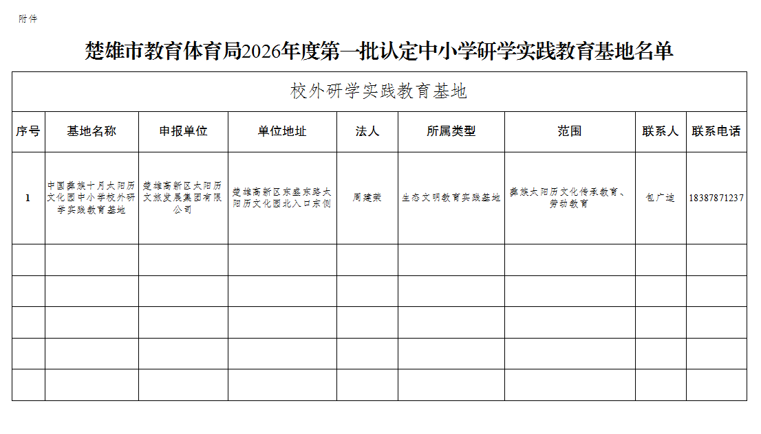 附件:楚雄市教育体育局2026年度第一批拟认定中小学研学实践教育基地公示名单