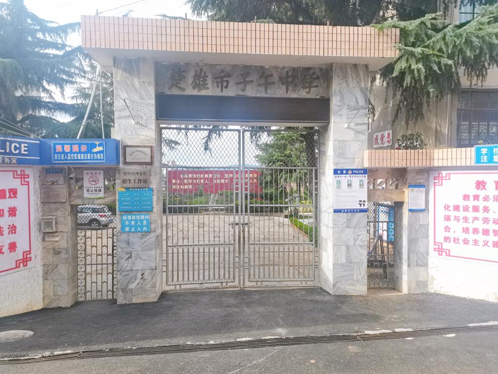 楚雄市子午镇子午初级中学创建于1987年3月,1992年搬入现址。2000年12月,晋升为云南省一级初级中学,2004年4月督导评估为优秀学校。学校先后荣获“云南省优秀学校”、“楚雄州文明学校”、“楚雄州绿色学校”、“楚雄州平安校园”“市级文明单位”等荣誉称号。