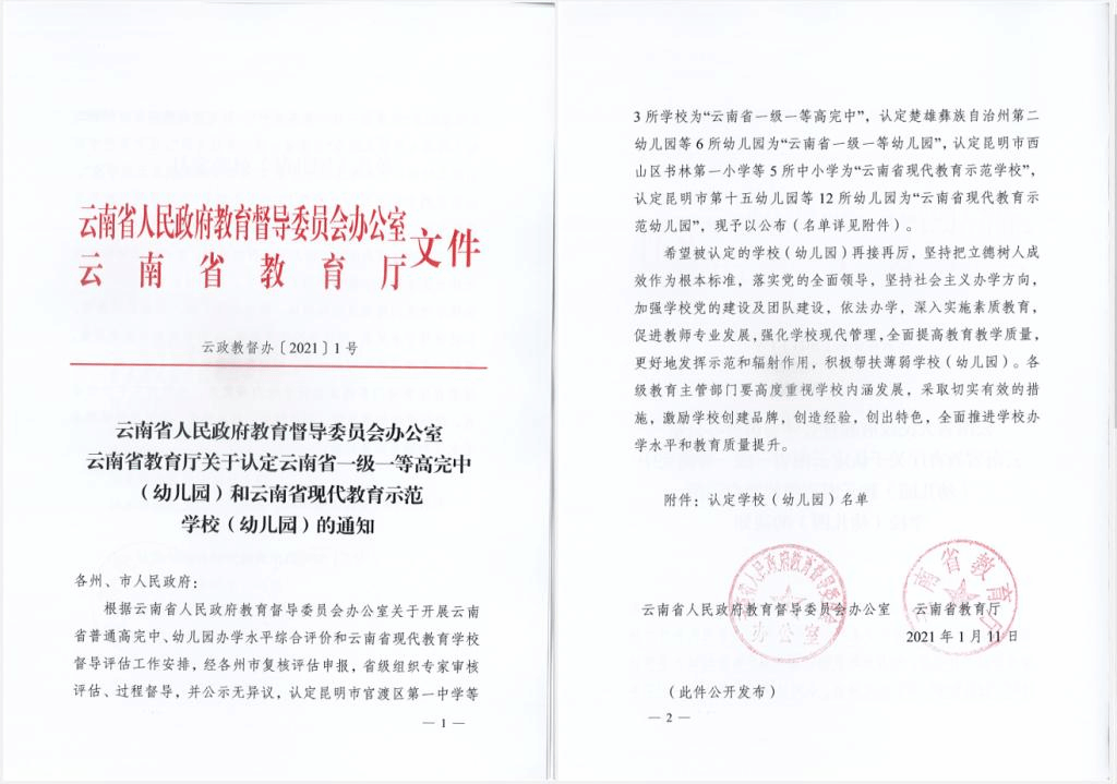 2021年1月11日,云南省人民政府教育督导委员会办公室、云南省教育厅印发《关于认定云南省一级一等高完中(幼儿园)和云南省现代教育示范学校(幼儿园)的通知》,公布了认定学校(幼儿园)名单,楚雄市东城幼儿园被认定为“云南省现代教育示范幼儿园”。