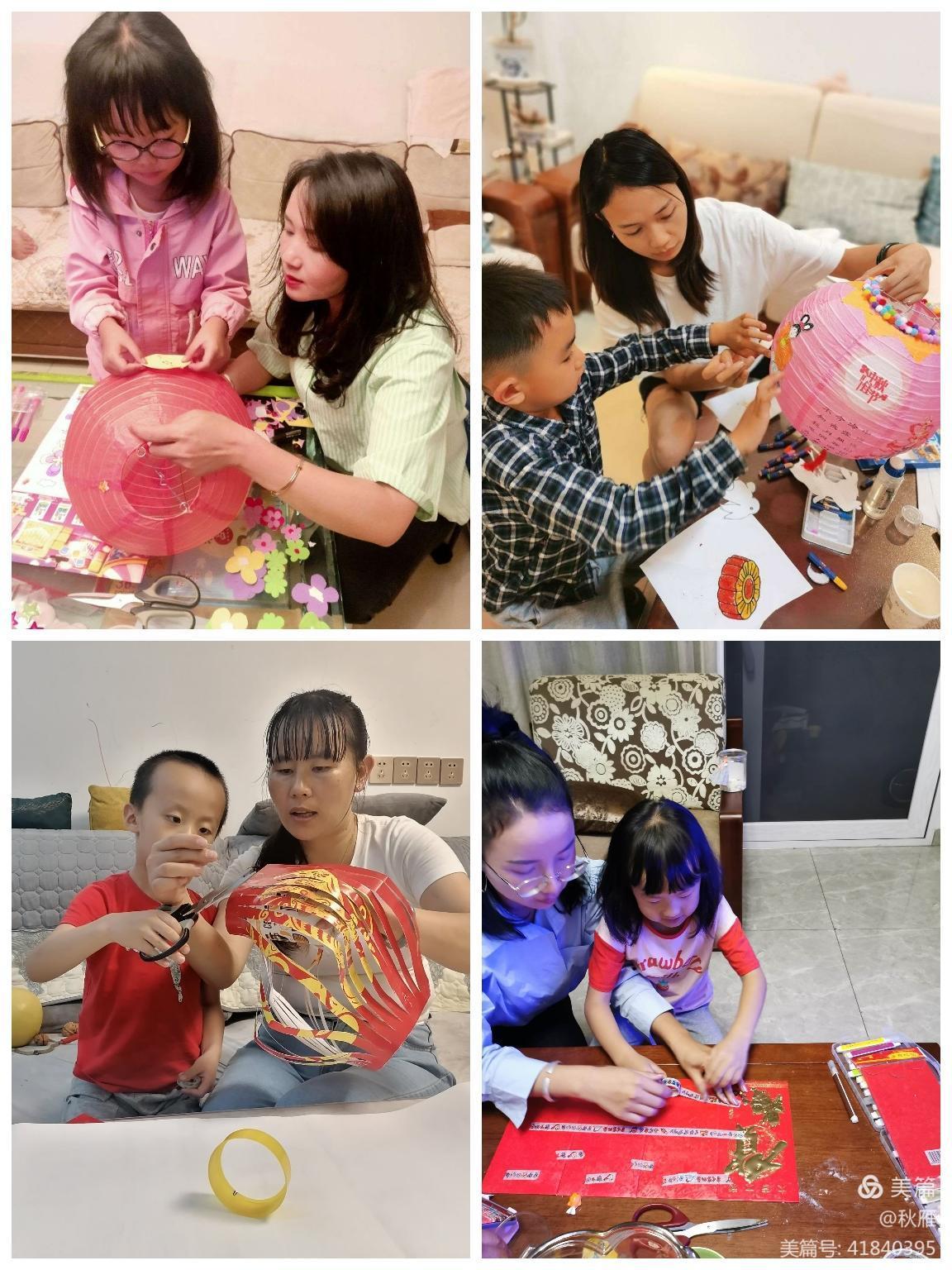 做灯笼——小小灯笼迎中秋,点点创意亮生活。大班的哥哥姐姐和爸爸妈妈一起制作了创意十足的灯笼,共同为欢庆中秋佳节准备着。