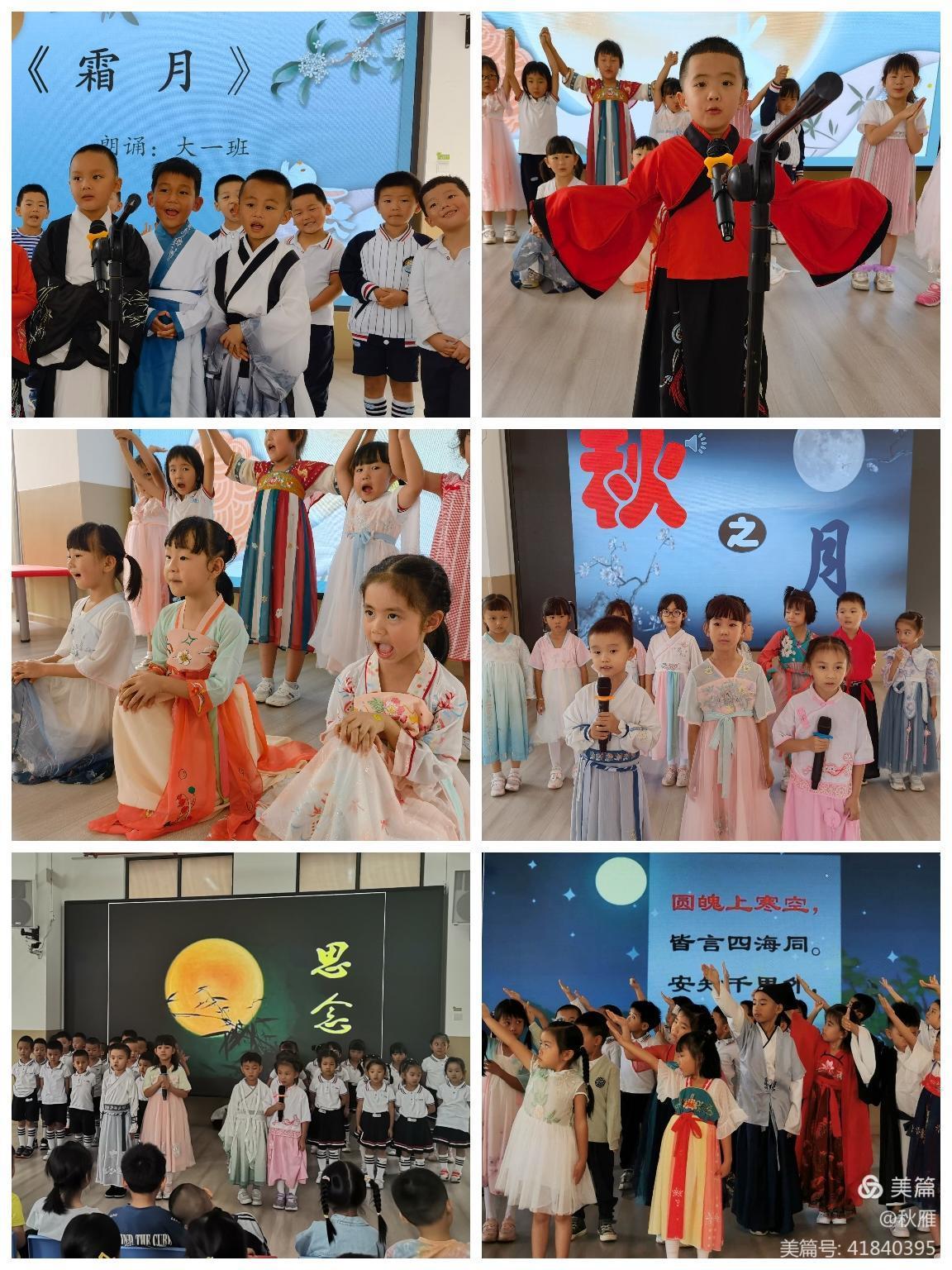 诵经典——大班级部开展了中秋诗歌朗诵会。孩子们在古典琴韵中诵读《古朗月行》、《水调歌头•明月几时有》 、《霜月》等与月亮有关的古诗词,感受了中秋诗词中的思亲之情。