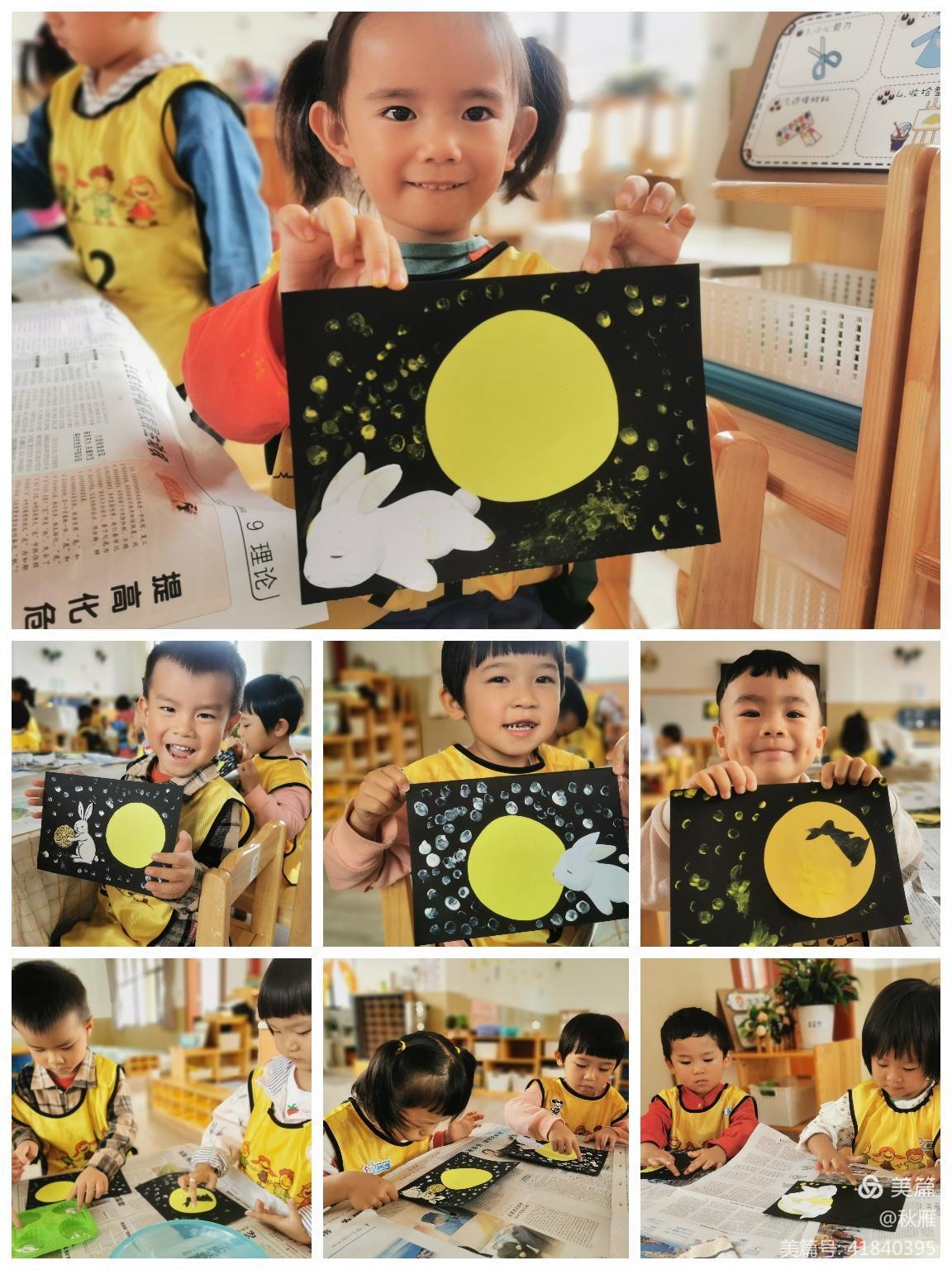 绘中秋——月饼是什么形状?有哪些图案?中秋前后月亮有什么变化?月兔是什么样子的?这些有趣的中秋意象都可以成为绘画的主题,拿起画笔和材料,落在纸上的每一笔和每一个作品都是孩子们想象力和创作力的结晶。