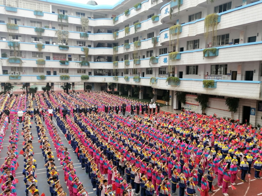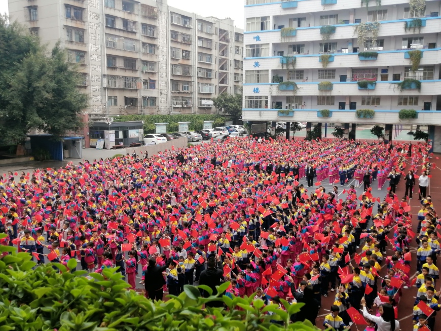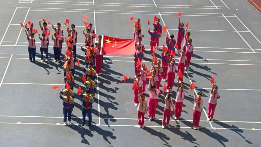“没有共产党就没有新中国”、“我和我的祖国一刻也不能分割”,全校师生挥舞手中的国旗高唱《没有共产党就没有新中国》《我和我的祖国》两首红色歌曲,孩子们用嘹亮的歌声表达他们对党忠诚的朴素情感,共同祝福祖国越来越好。