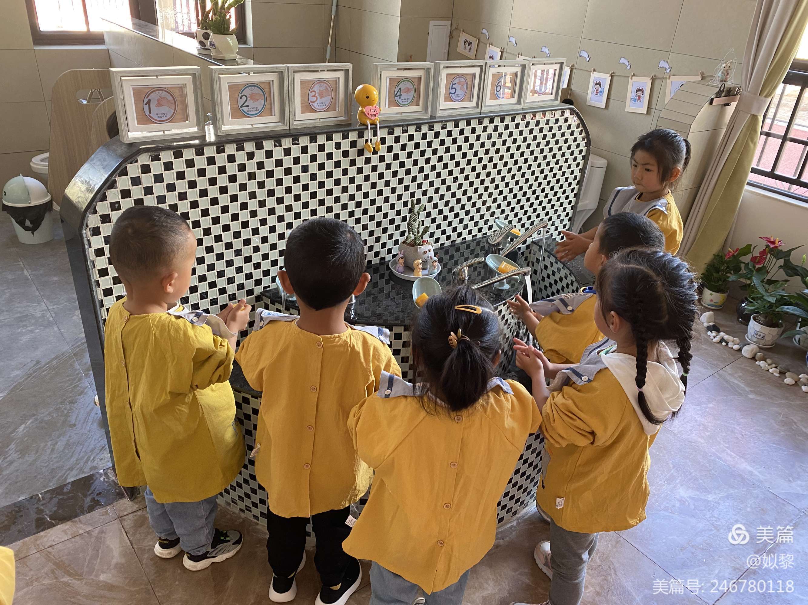 除了排队,老师还教我们学习七步洗手法,让我们把小手洗干净,我们洗得多认真呀!