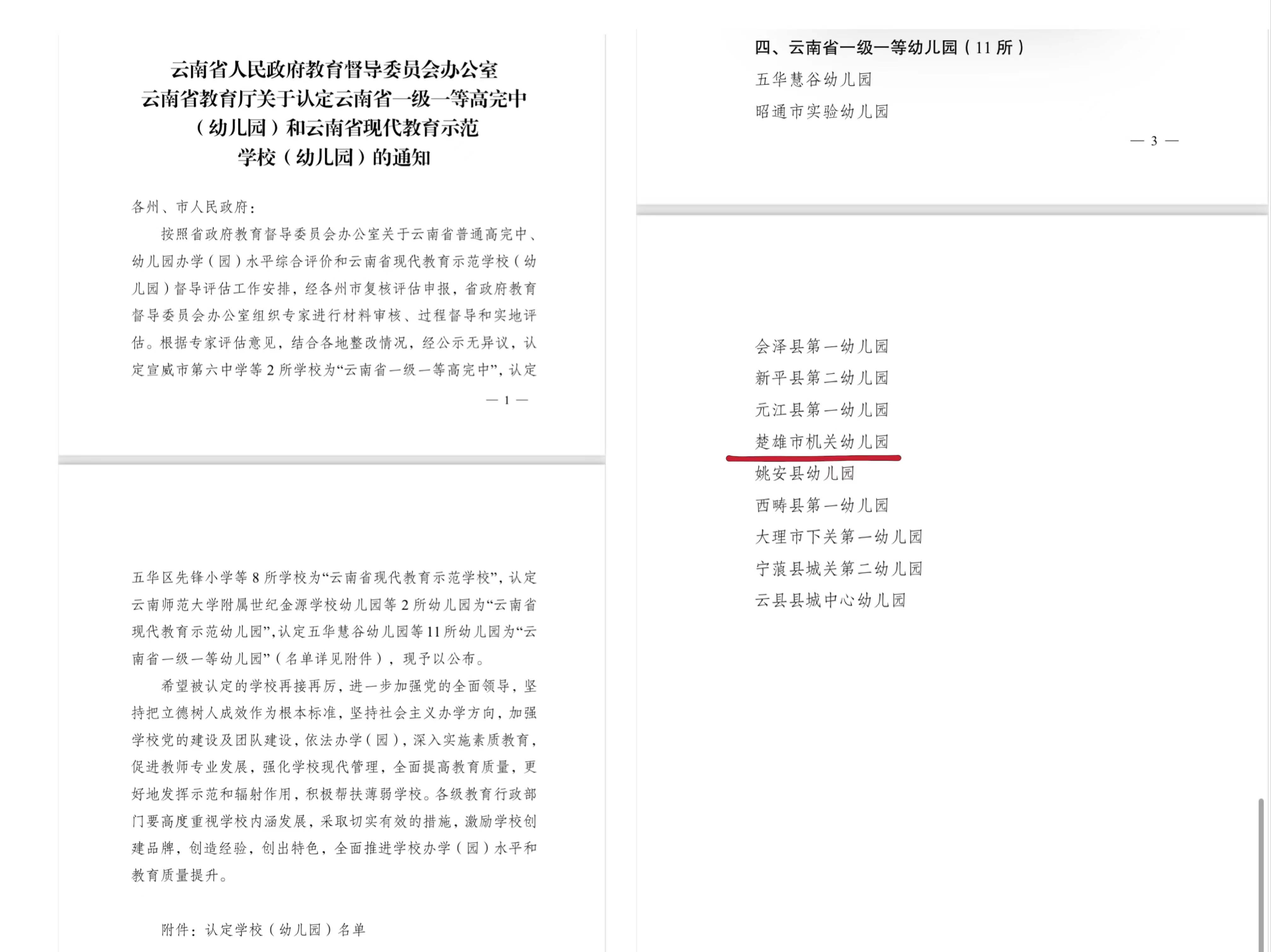 2022年1月云南省教育厅发文认定楚雄市机关幼儿园为“云南省一级一等幼儿园”。