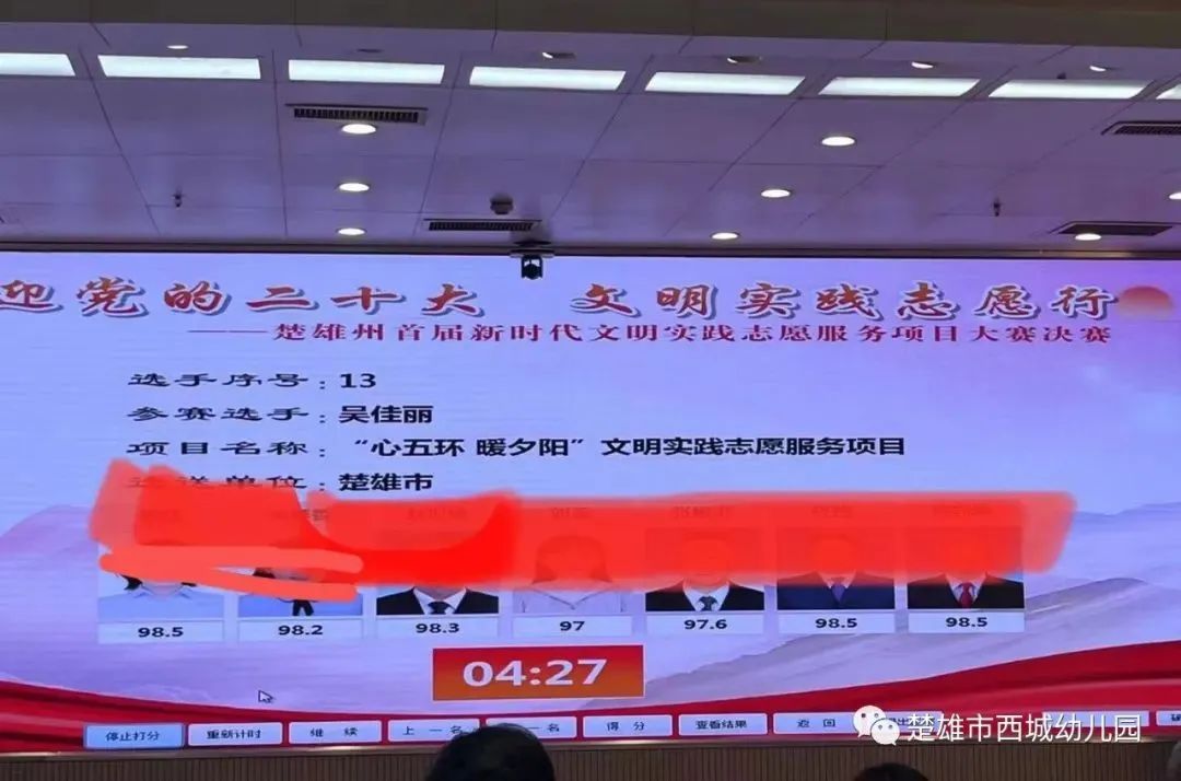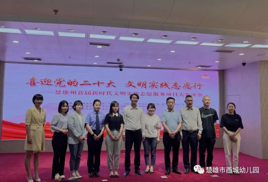 楚雄州举办首届新时代文明实践志愿服务项目大赛决赛,楚雄市西城幼儿园“心五环暖夕阳”文明实践志愿服务项目由楚雄市推荐参赛,通过项目审核、文稿比拼、网络投票、PPT路演答辩,从全州58个项目中脱颖而出,最终以最高分的成绩荣获金奖。