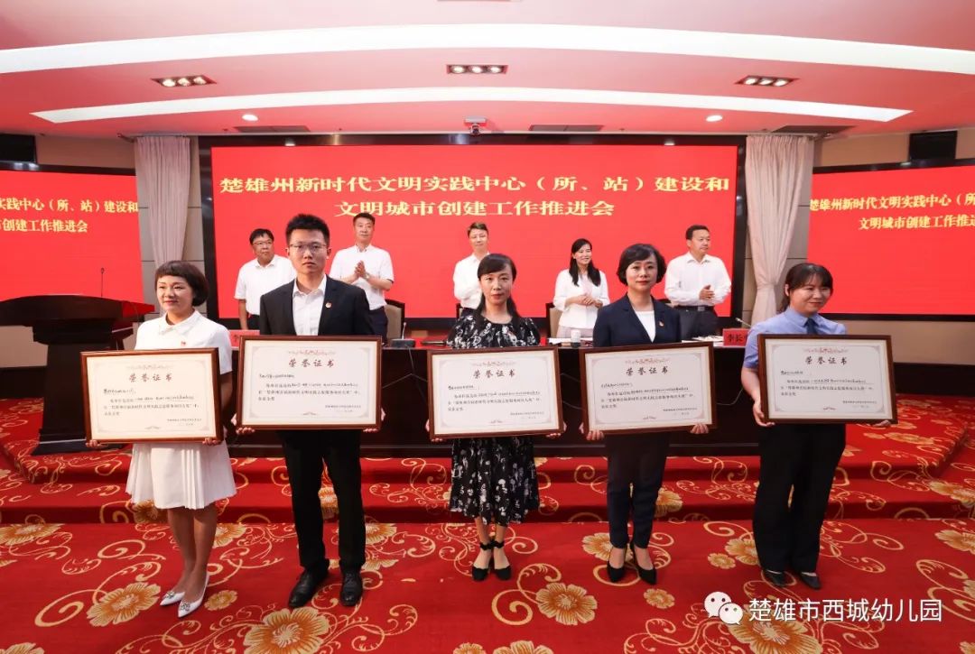 2022年6月30日下午,在楚雄州新时代文明实践中心(所、站)建设和文明城市创建工作推进会上,州委书记刘勇等领导为获奖单位颁发了荣誉证书,西城幼儿园书记、园长杨涛代表幼儿园领奖。