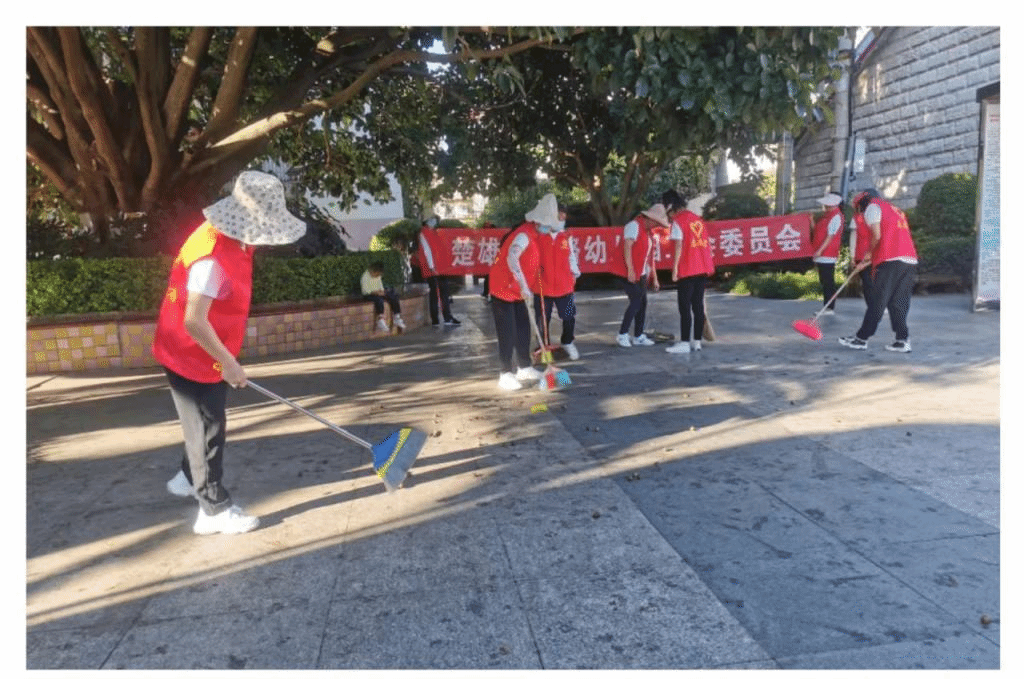 走出新时代文明实践中心。全体员工带上工具在桃园湖广场进行志愿清扫服务活动。在志愿服务活动中进一步提升全体员工的思想境界和道德水平。