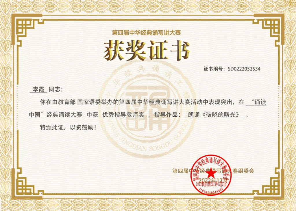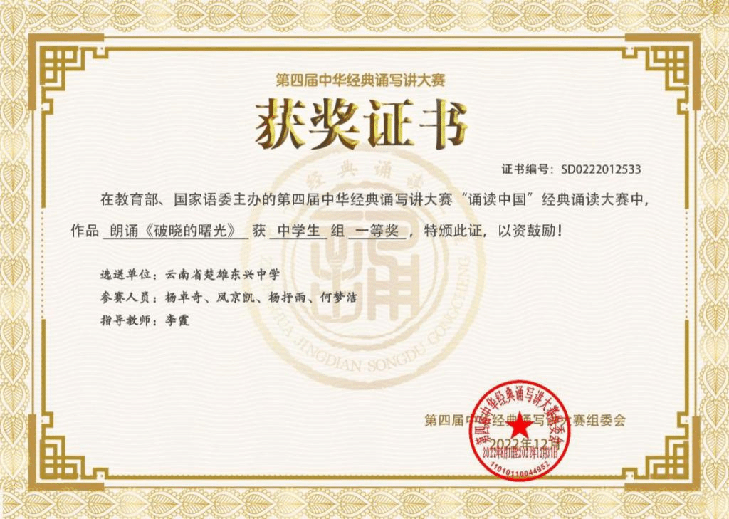 为贯彻落实中共中央办公厅、国务院办公厅《关于实施中华优秀传统文化传承发展工程的意见》,落实全国语言文字会议精神,全面深入实施中华经典诵读工程,依据《教育部评审评估和竞赛清单》和《中华经典诵写讲大赛管理办法(试行)》,2022年教育部、国家语委举办了第四届中华经典诵写讲大赛,经楚雄市教育体育局、楚雄市语委办选拔推荐,楚雄东兴中学由杨卓奇、凤京凯、杨抒雨、何梦洁四名同学朗诵的经典诵读作品《破晓的曙光》参加了云南省第四届“云岭杯”中华经典诵写讲大赛“书香彩云南”“诵读中国”经典诵读大赛荣获中学生组一等奖,并被选送参加全国总决赛,荣获国家级一等奖,东兴中学李霞老师荣获国家级“优秀指导教师奖”。