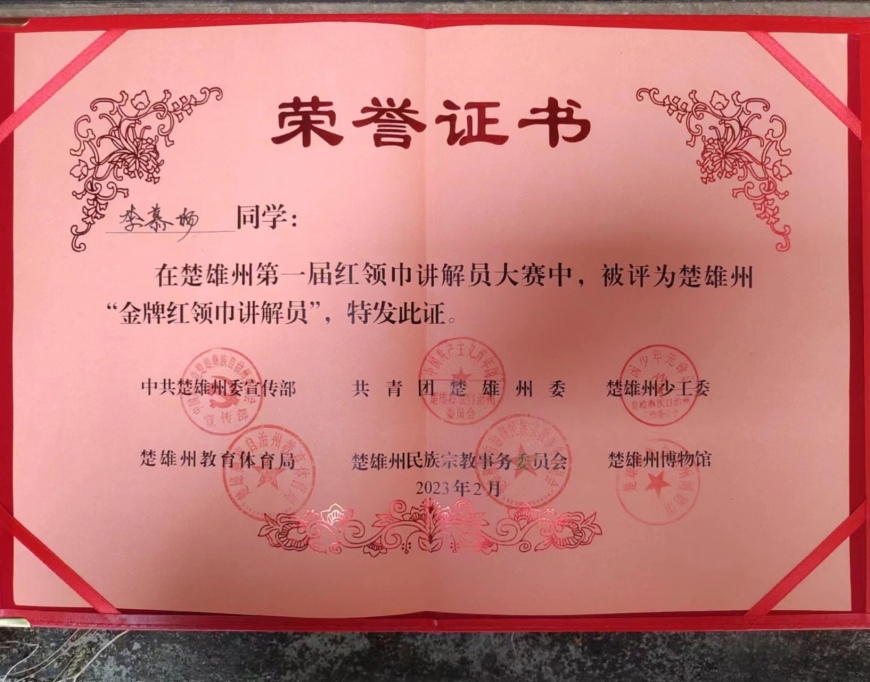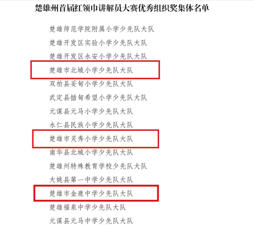 在刚刚落幕的楚雄州首届红领巾讲解员大赛决赛中,楚雄市金鹿中学少先队大队、楚雄市北城小学少先队大队、楚雄市灵秀小学少先队大队获得楚雄州首届红领巾讲解员大赛“优秀组织奖”,金鹿中学少先队员李慕杨同学喜获佳绩,被评为楚雄州“金牌红领巾讲解员”。