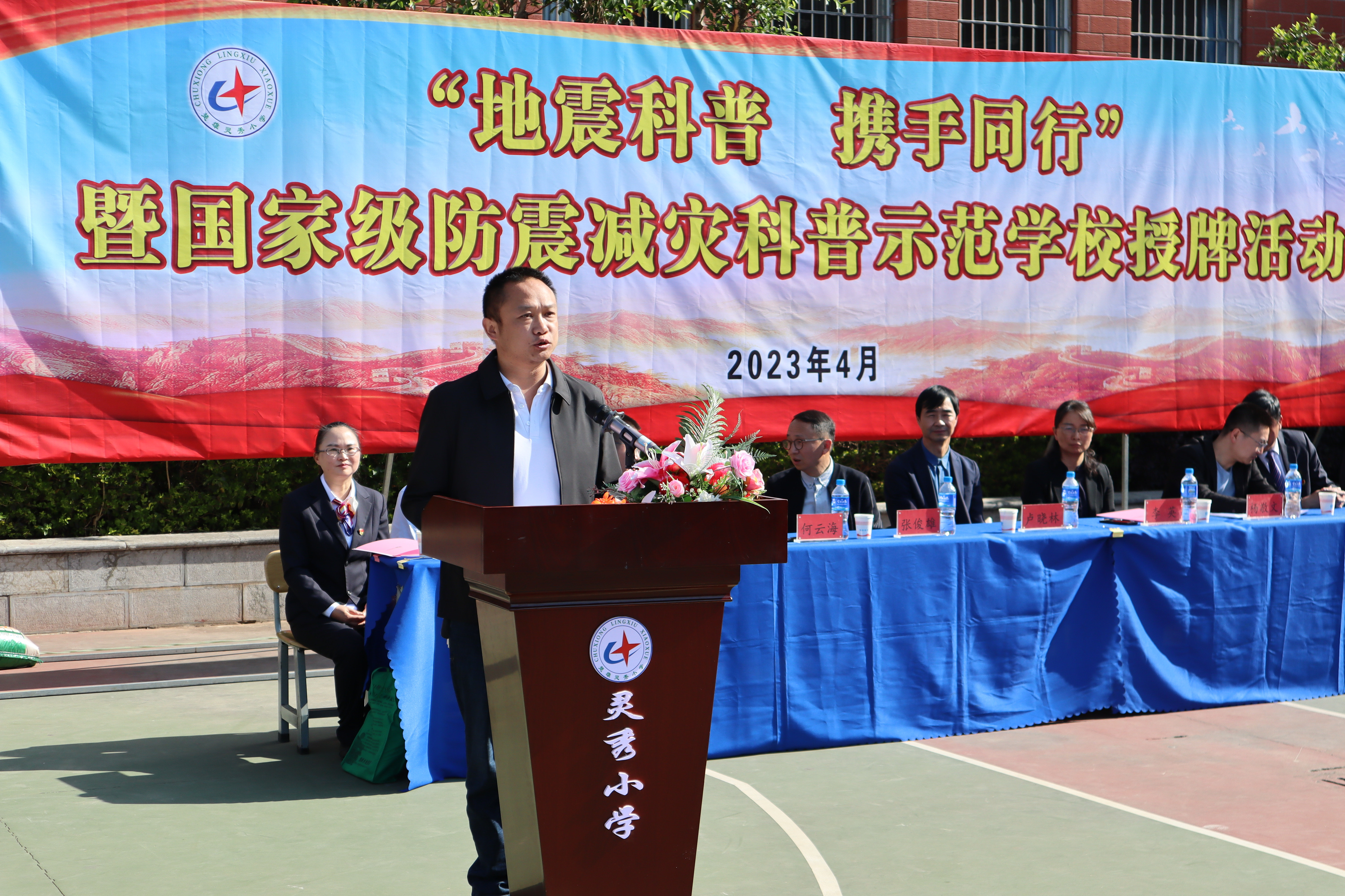 2023年4月6日上午,“国家级防震减灾科普示范学校”授牌仪式在楚雄市灵秀小学隆重举行。楚雄州地震局局长卢晓林、楚雄市人民政府副市长李英、楚雄州地震局震害防御科科长张俊雄、楚雄市地震局局长杨敬文、楚雄市教育体育局副局长何云海、楚雄市地震局综合业务科科长刘文畅,以及灵秀小学全体师生参加了授牌仪式。授牌仪式由校长甘清梅主持。