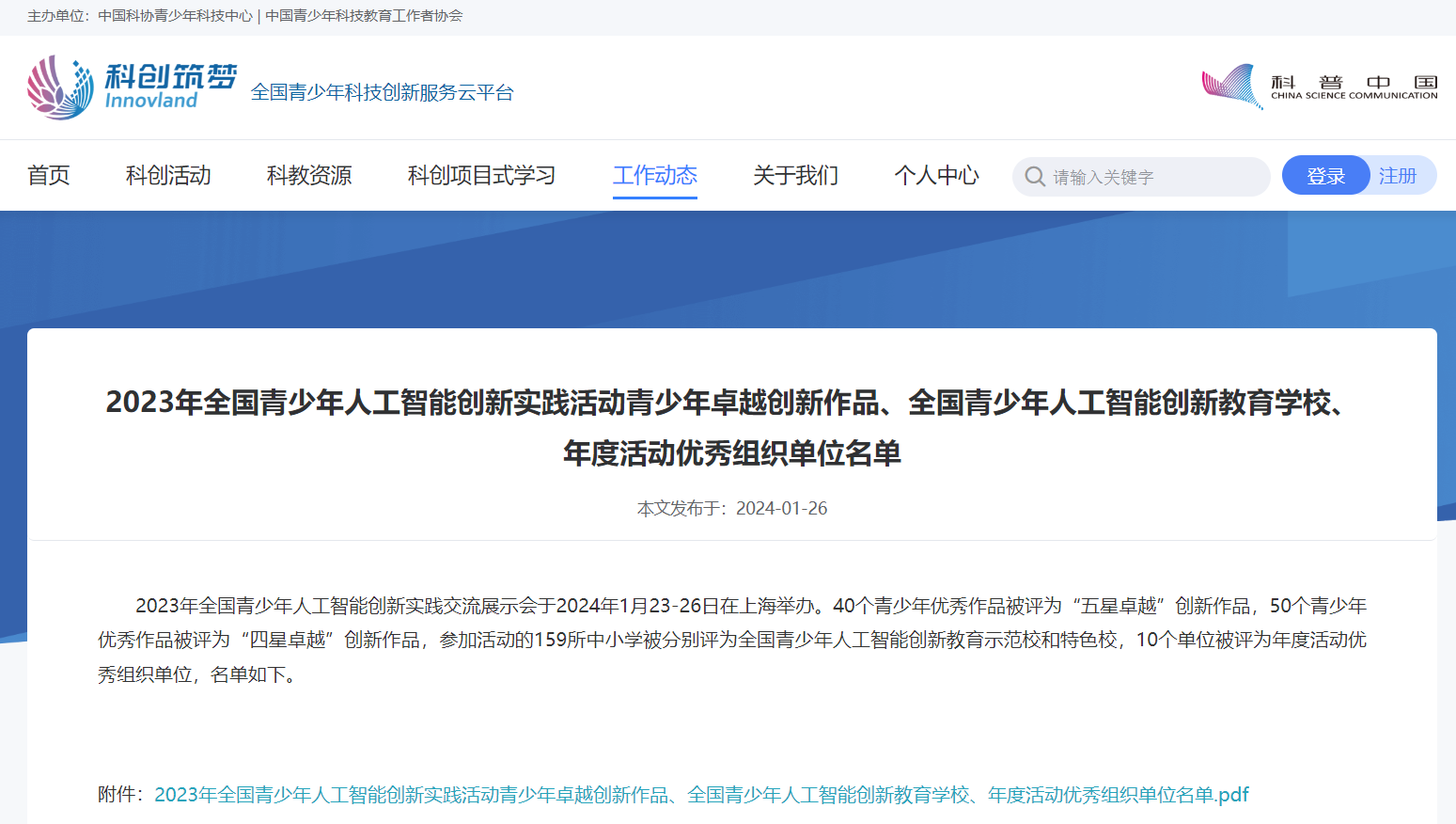 本次获评“全国青少年人工智能创新教育特色校”,是对学校人工智能教育的充分肯定。以后学校将借助“科创筑梦——全国青少年科技创新服务云平台”,继续组织开展编程体验、学习交流、科技实践等人工智能科普活动,在人工智能教学工作上不断开拓创新,探索特色育才之道,为培养人工智能后备人才贡献力量。