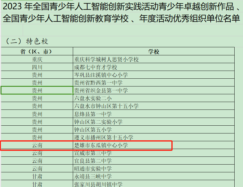 2023年全国青少年人工智能创新实践交流展示会于2024年1月23-26日在上海举办。楚雄市东瓜镇中心小学获评“全国青少年人工智能创新教育特色校”。