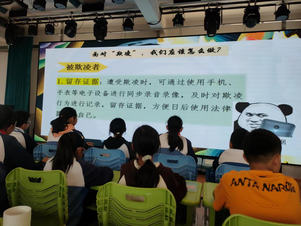 吴艳华老师结合浅显易懂的小视频、生动的案例,联系实际,以法论事,深入浅出地给学生们讲解了校园欺凌的界定、类型、形式,校园欺凌的角色、危害,校园欺凌可能触犯的刑法罪名,以及从被欺凌者和旁观者的角度为学生们在面对欺凌时给出了一些合理而切实可行的建议。告诫同学们必须警钟长鸣,增强法治观念,提高法治意识。提醒同学们纠正日常生活中的不良行为,让每一位学生都学会利用法律武器保护自己,切实维护自身的合法权益,同时知道哪些行为会触犯法律,守住自身的行为底线,做一名合格的小学生。吴艳华老师希望孩子们在一个充满温暖、充满爱的大家庭里健康快乐的学习成长。最后,吴艳华老师邀请全体师生参与拒绝校园欺凌,共建和谐校园公约的宣誓。
