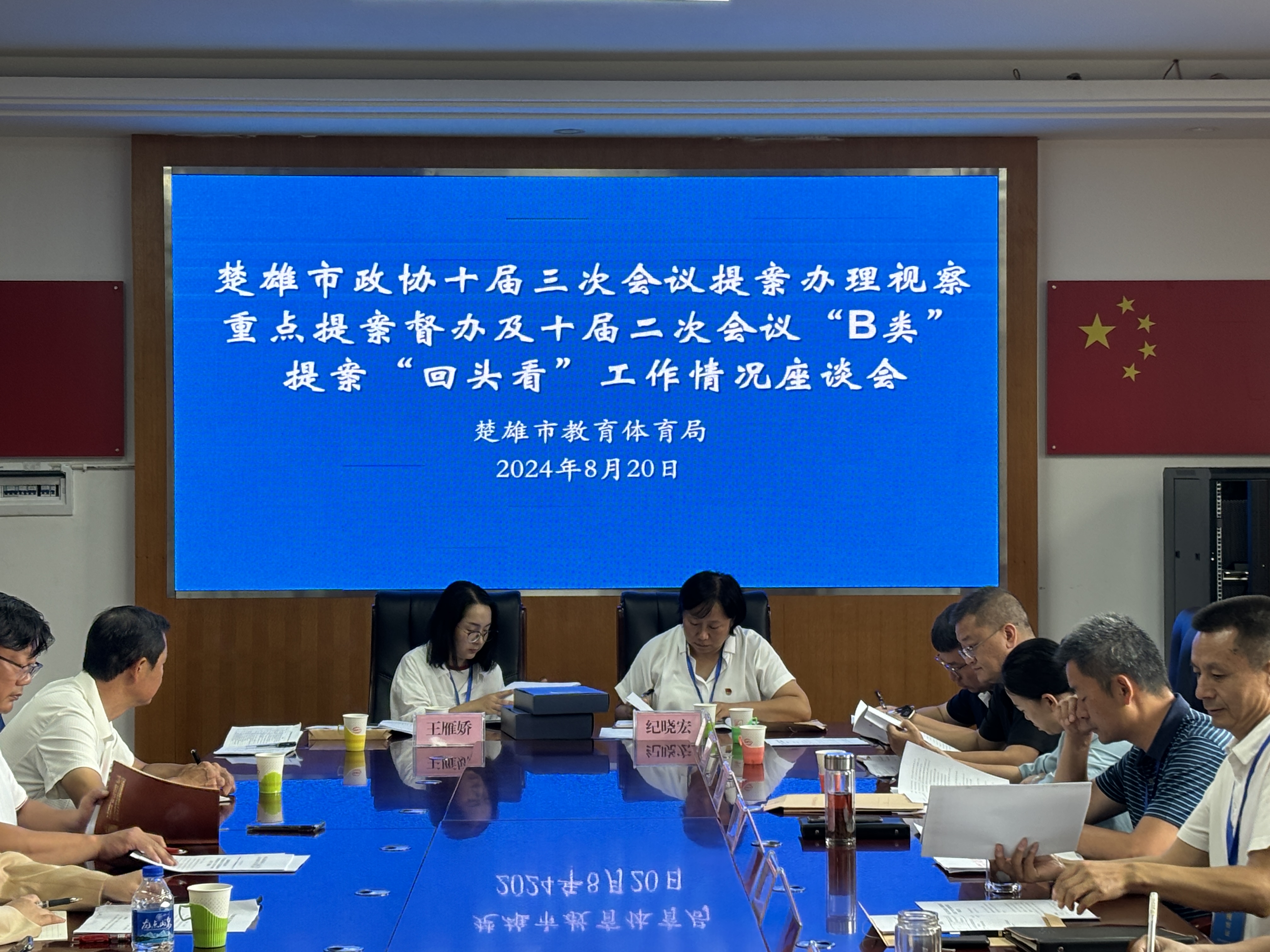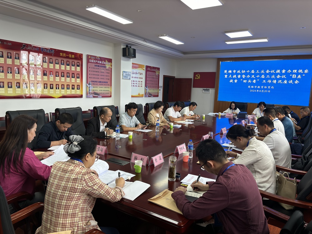2024年8月20日上午,为进一步推进市政协十届三次会议提案、重点提案及2023年“B类”提案“回头看”工作的办理落实,在市政协党组副书记、副主席王崇福、市政协副主席吴兆强的带领下楚雄市政协视察团一行15人,到市教育体育局开展视察及督办。视察团在市教育体育局副局长李长会、安全管理科科长倪靖、办公室副主任普阳、教育科尹久国等人陪同下,实地查看了青少年校外活动中心青少年心理健康教育情况,北浦中学开展青少年法制教育情况,东兴中学食堂食品安全监管情况,随后在市教师培训中心会议室查阅资料并召开座谈会。