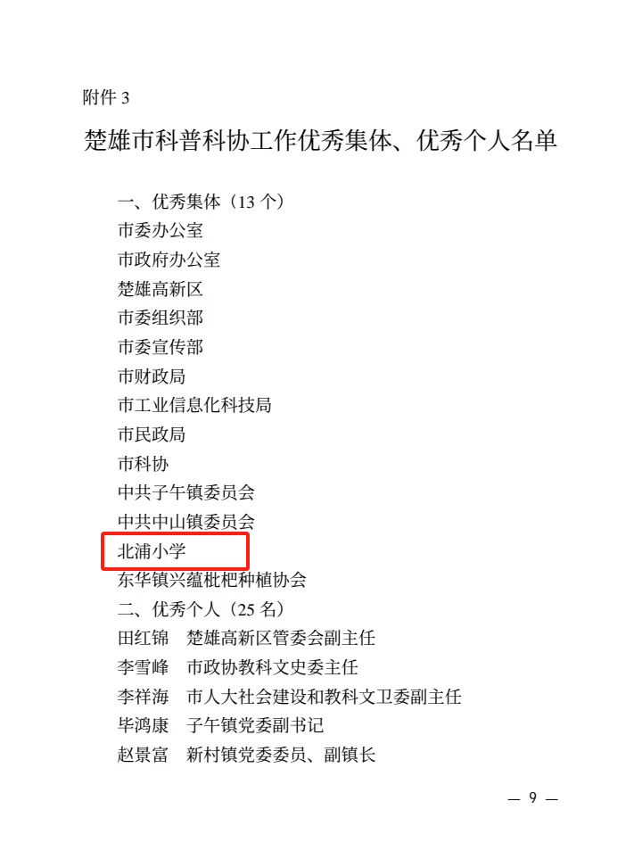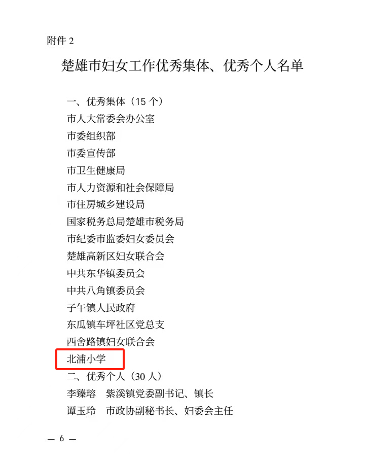 近日,市委、市人民政府下发《关于表扬工会工作、妇女工作、科普科协工作优秀集体和优秀个人的通报》(市党通【2024】13号),北浦小学荣获“楚雄市妇女工作优秀集体”“楚雄市科普科协工作优秀集体”称号。