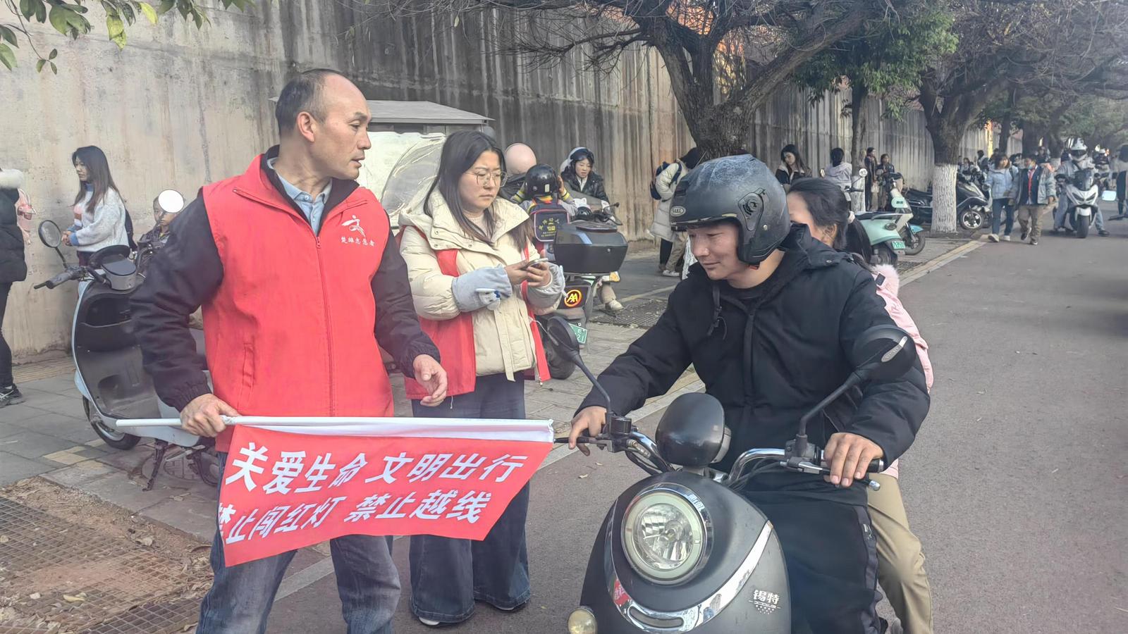 与此同时,学校安排志愿者教师每天走到校门口,在每天上下学高峰时段,针对学校部分学生及家长接送学生上下学时不能严格落实“一盔一带”的情况,进行耐心劝导,提高学生及家长的安全意识,并通过督促老师做学生表率,学生做家长表率来营造全校师生“一盔一带”的良好氛围。“我一定会以身作则,规范佩戴安全头盔,并劝告身边的电动车、摩托车骑乘人员,出行时一定要佩戴安全头盔,给孩子做好榜样。”六年级学生家长唐启菊表示。
