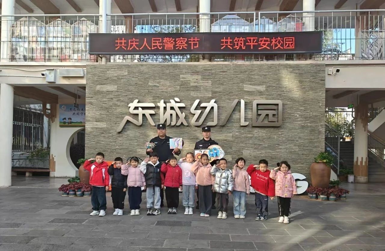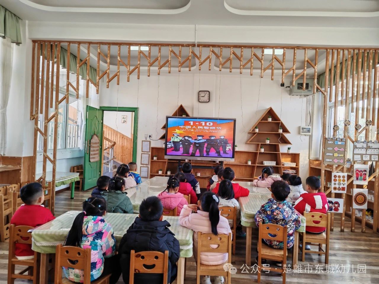为了提高幼儿对警察职业的了解,激发幼儿的感恩之心与敬佩之情,增强幼儿的法律意识和安全意识。在第5个“中国人民警察节”到来之际,楚雄市东城幼儿园组织开展“共庆人民警察节 共筑平安校园”系列主题教育。