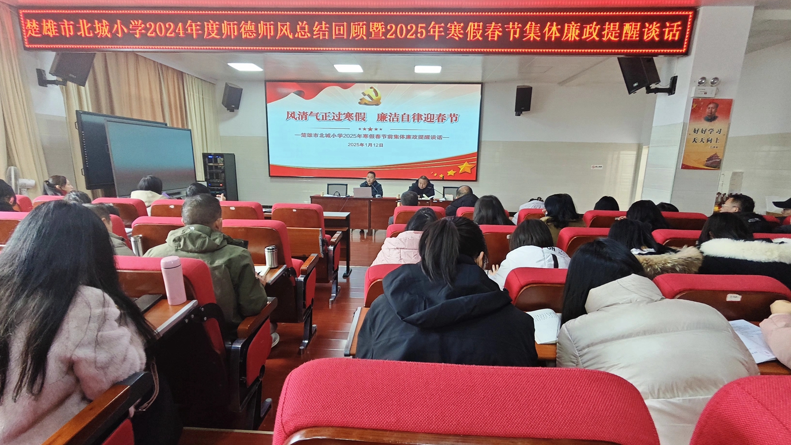 为进一步加强全面从严治党,持续加强“四风”建设,筑牢广大党员干部、全体教职工廉洁防线,在寒假与春节临近之际,在这一关键时间节点,2025年1月12日下午,北城小学全体教职工在南路校区参加放假前工作会议,认真总结回顾2024年度各项工作,安排部署2025年主要工作任务,开展2025年寒假春节前集体廉政提醒谈话。