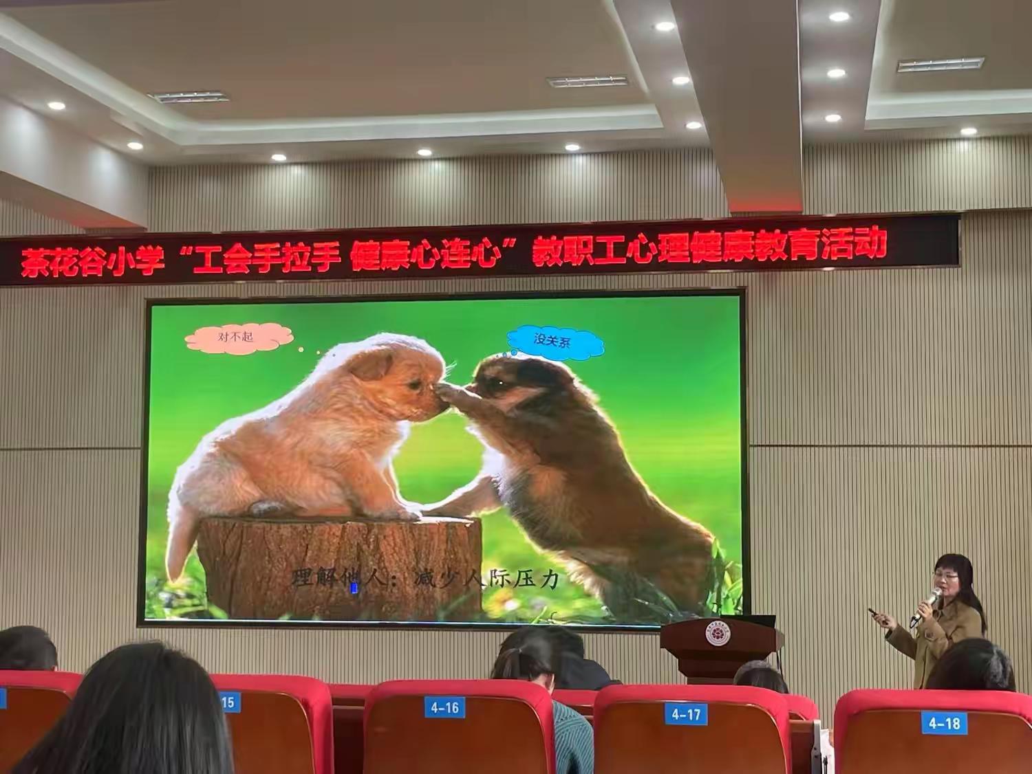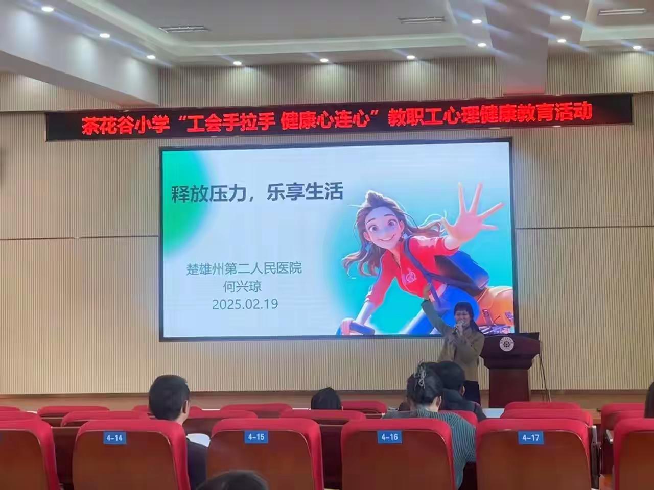 随着城镇化进程的不断加快,广大人民群众对教育的期望值越来越高,加之我校人员配备不足,广大教职工工作任务繁重,长期处于超负荷运转状态,精神压力日益增大,身心健康不容乐观。为帮助广大教职工及时有效地抑制和化解不良情绪,2025年2月19日下午,楚雄市茶花谷小学举办了一场别开生面的心理健康辅导讲座。