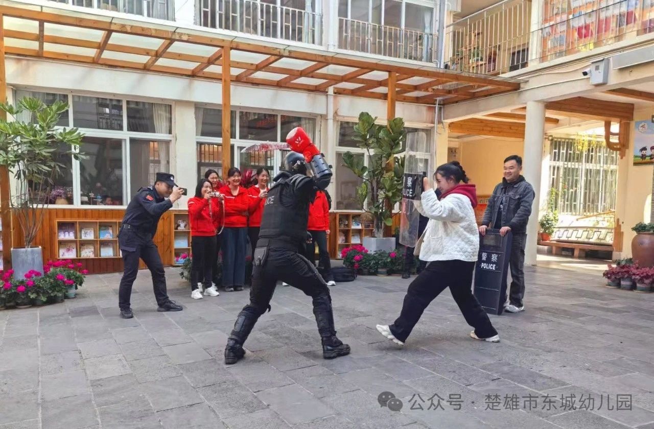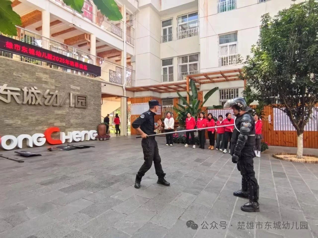 为切实提升师幼的安全意识,强化面对歹徒行凶等突发暴恐事件时的应急应变能力,加强教师与各部门间的协同配合,提升幼儿园应对突发事件的处置水平以及全体师幼的自护逃生能力,3月4日上午,楚雄市东城派出所特邀楚雄市公安局巡特警大队特警走进楚雄市东城幼儿园,为教职工开展了一场专业的防暴安全培训。