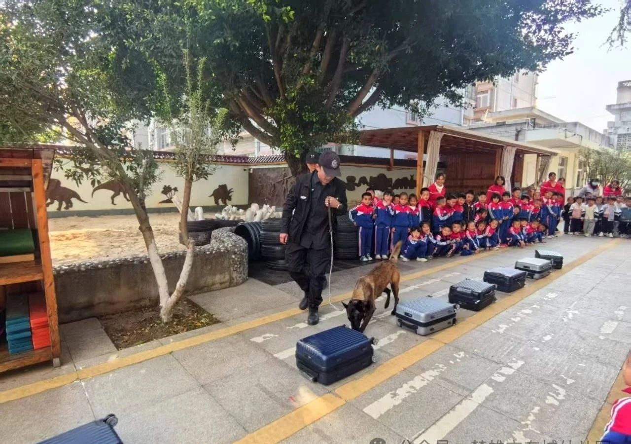 防暴安全培训结束后,特警们带着威风凛凛的警犬,为全园小朋友们带来了一场精彩绝伦的技能展示,演示了警犬寻找犯罪人员和危险物品的过程。小朋友们首次近距离观看警犬表演,现场气氛热烈,他们被警犬的敏捷身姿和出色本领深深吸引,对特警和警犬充满了好奇与敬佩。