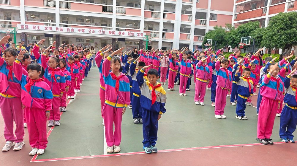 活动在庄严的升旗仪式中拉开帷幕。伴随着雄壮的国歌,五星红旗冉冉升起,全体师生肃立行注目礼,嘹亮的歌声里满是对祖国的崇敬与热爱。升旗仪式后,出队旗仪式如期举行,鲜艳的队旗在旗手的护送下缓缓入场,少先队员们佩戴着红领巾,高唱《中国少年先锋队队歌》,坚定的眼神、昂扬的姿态,展现出新时代少先队员的精神风貌。