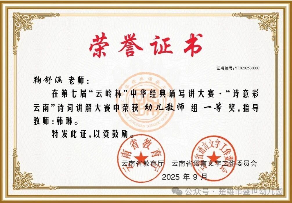 在由云南省教育厅、云南省语言文字工作委员会组织的第七届“云岭杯”中华经典诵写讲大赛中,楚雄市盛世幼儿园鞠舒涵老师的诗词讲解作品《悯农(其二)》荣获幼儿教师组一等奖。