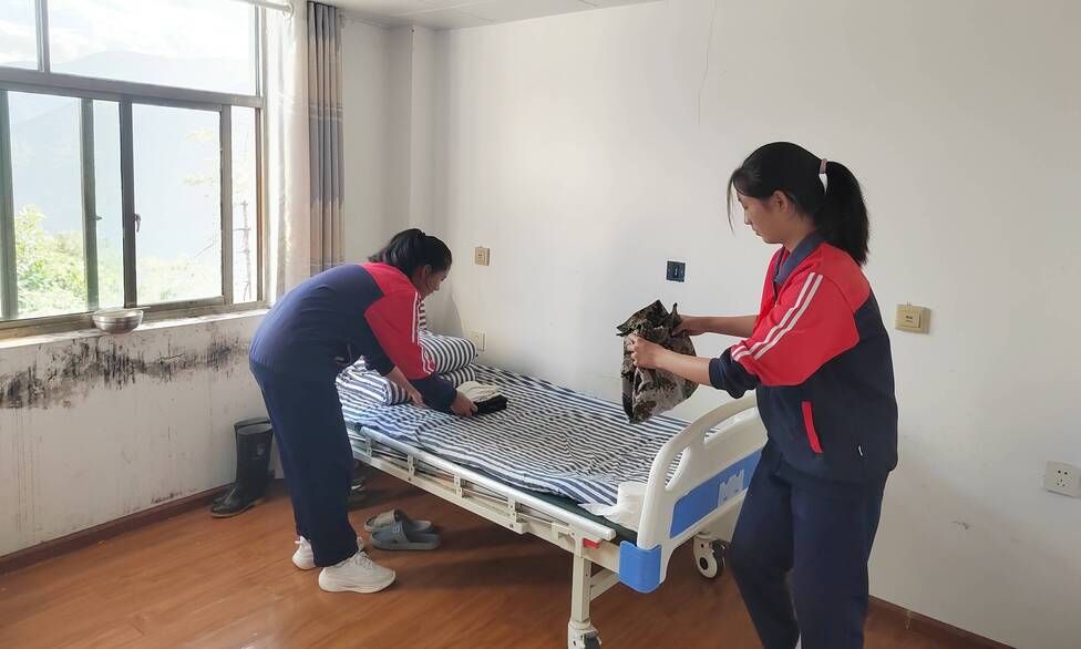 活动现场,同学们分工明确、干劲十足。几名女生围在老人的床边,小心翼翼地将被褥铺平、叠成方方正正的“豆腐块”,还细心地把老人的衣物分类叠好放进衣柜;男生们则拿起扫帚、抹布,认真清扫庭院落叶、擦拭门窗桌椅,不放过任何一个卫生死角,不一会儿就把敬老院打理得干净整洁。庭院的石桌旁,几位同学围坐着为老人剥橘子、削梨,将切好的水果块递到老人手中,还耐心地听81岁的王爷爷讲过去的农耕故事,时不时点头回应,时不时发出清脆的笑声。党员教师们则陪着行动不便的老人散步聊天,详细询问他们的身体状况和生活需求,一句句关切的问候、一个个温暖的眼神,让老人们脸上始终洋溢着幸福的笑容。