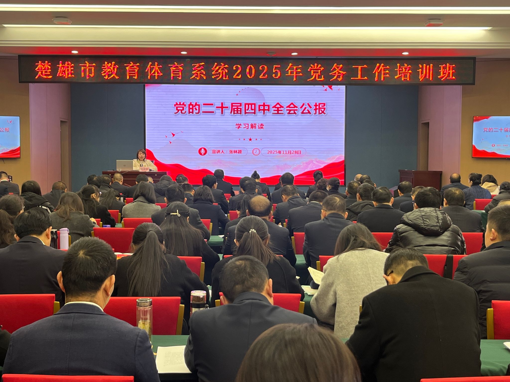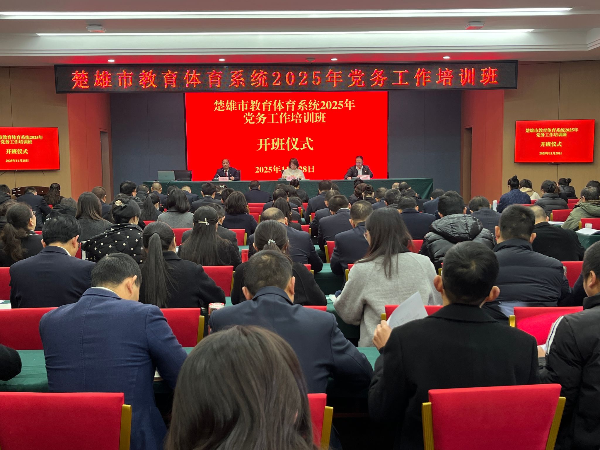 为深入学习贯彻党的二十届四中全会精神,进一步提升教育体育系统党建工作规范化水平与从业人员履职能力,11月28日,楚雄市教育体育系统2025年党务工作培训班在楚雄市职业高级中学正式开班。全市教育体育系统各级党组织书记、中小学校园长、党务工作者及民办学校负责人共约180人齐聚一堂,开启为期两天的集中学习提升之旅。