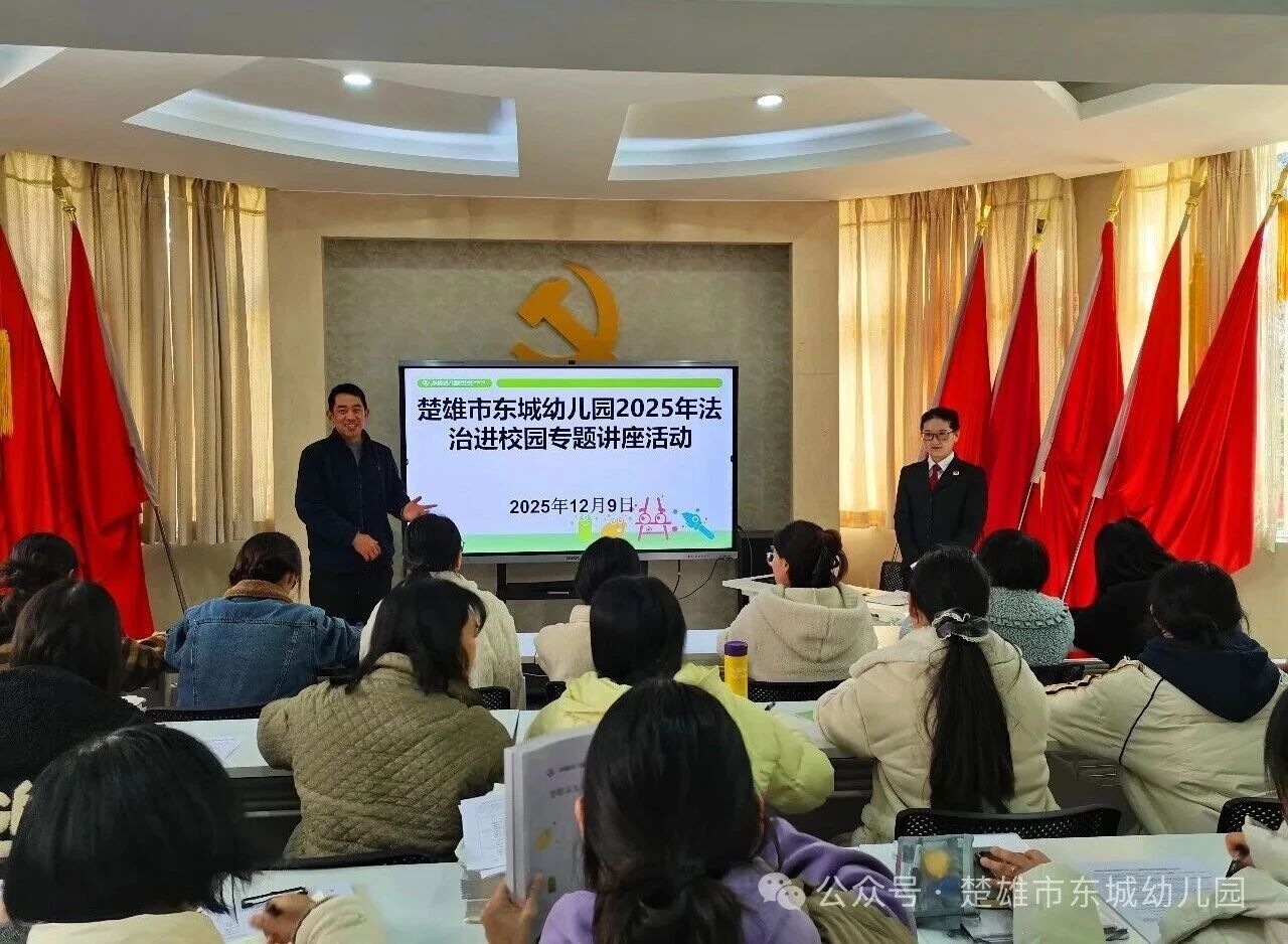 2025年12月9日中午,楚雄市东城幼儿园特邀楚雄市人民检察院检察官、幼儿园法治副校长万丽,开展“育人以法 润物无声”利剑护蕾专题讲座,为全园教师带来一场兼具专业性与实用性的法治培训。讲座中,万检察官紧扣幼儿园教育工作实际,围绕未成年人犯罪预防、校园保护法律常识、依法执教三大核心议题,以法规解读结合典型案例的形式,为园所未成年人保护工作提供精准指导。