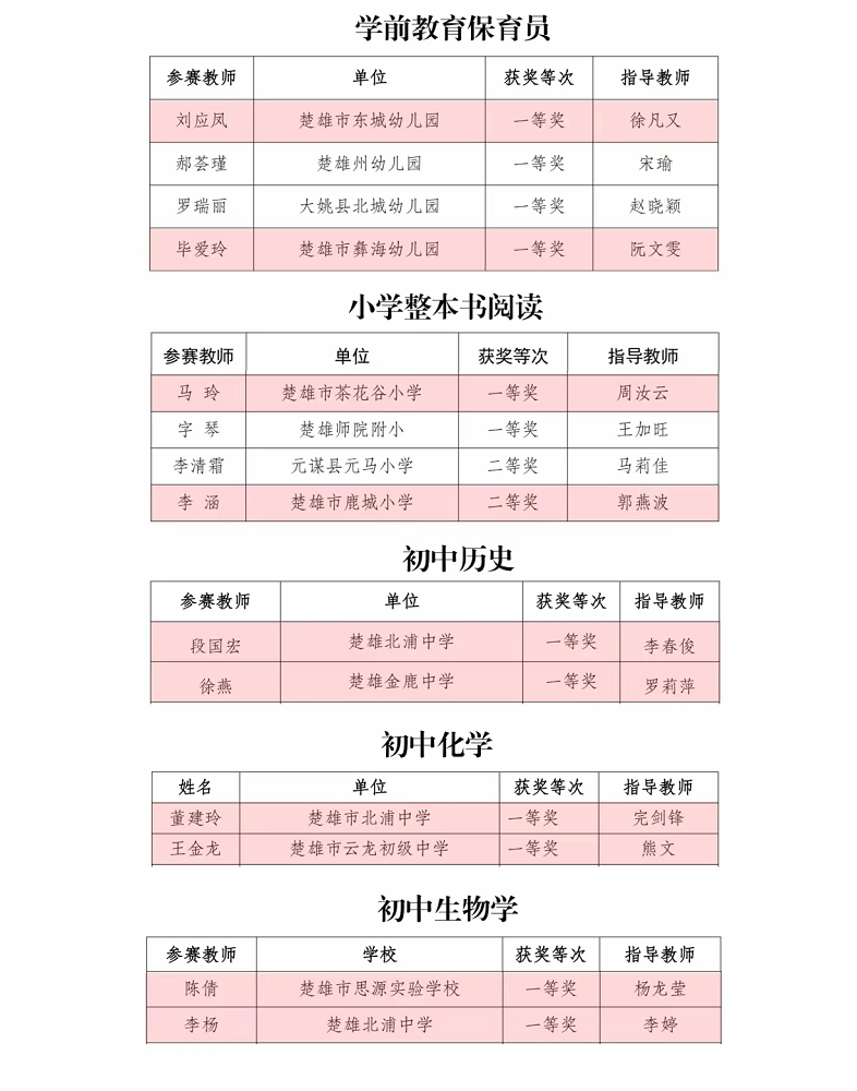州级为“舞台”、重提升,以“尽锐出战,争创佳绩”为目标,检验队伍建设成效。2025年11月至12月,在楚雄州教育体育局举办的“楚雄州第一届学前教育保育员、小学语文整本书阅读、初中历史、化学、生物学学科课堂教学竞赛”中,楚雄市10名参赛教师共斩获一等奖9个、二等奖1个,一等奖占比高达90%,以绝对优势位居全州榜首,取得近年最佳成绩。