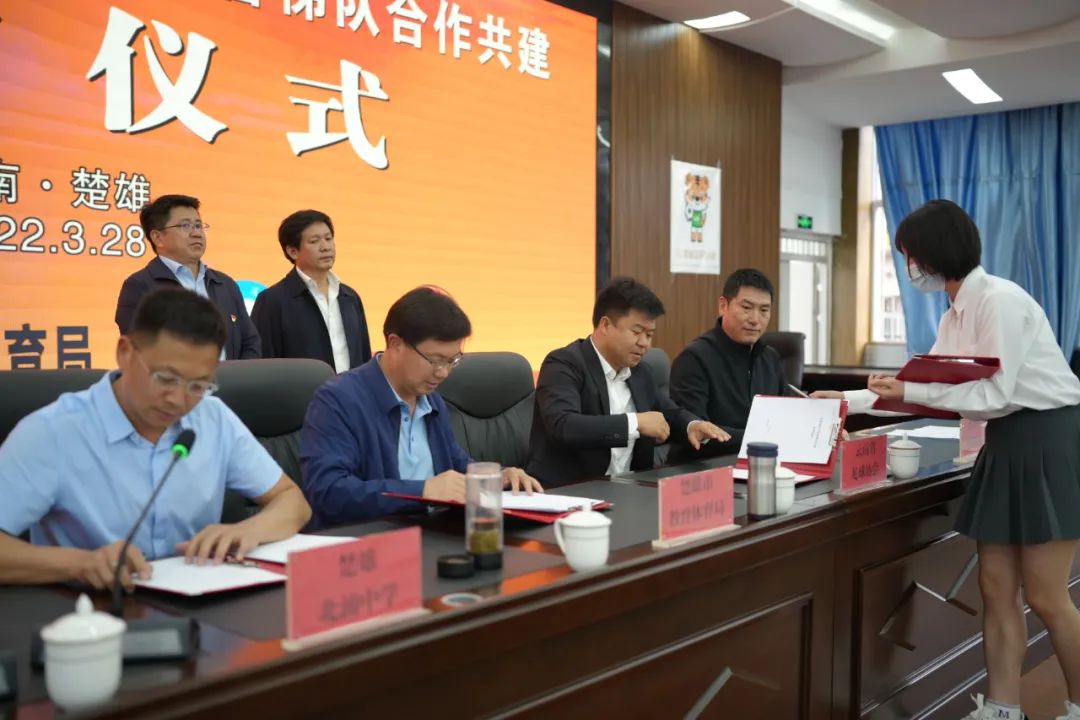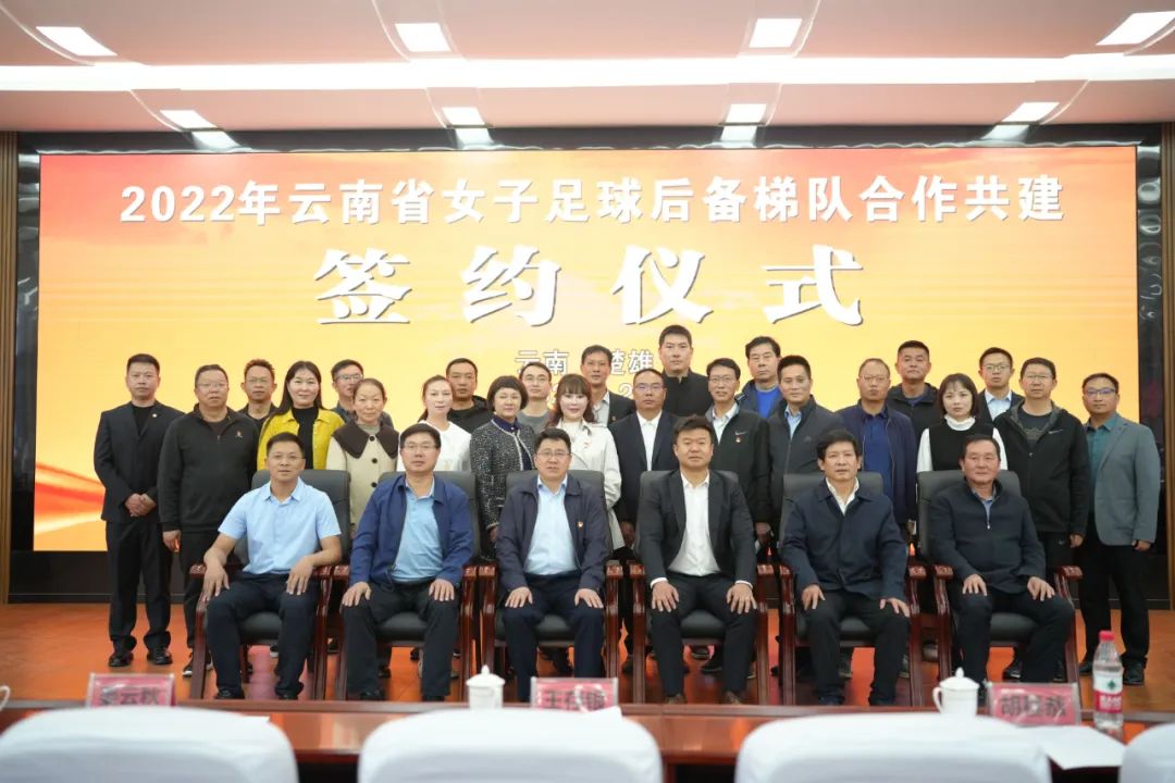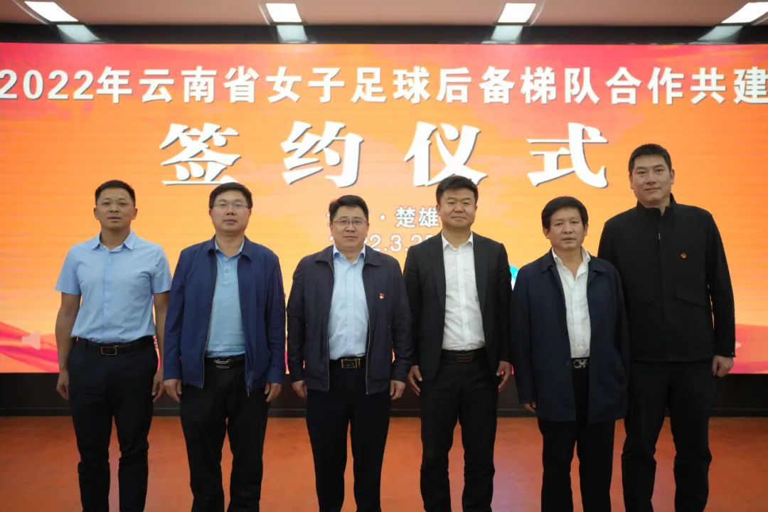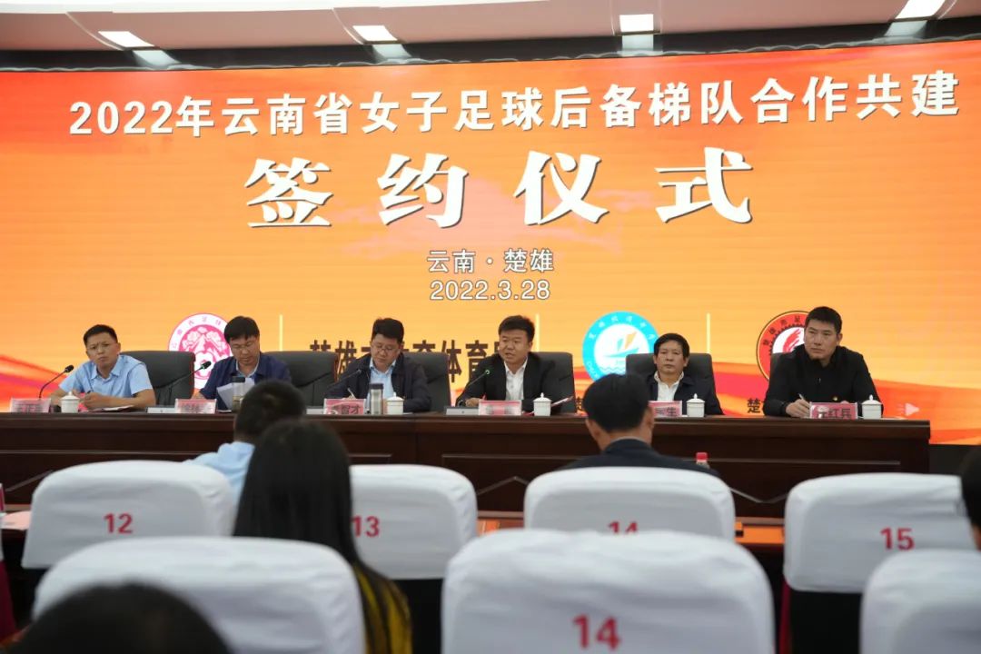 云南省足球协会分别与楚雄市教育体育局、楚雄北浦中学、楚雄市足球协会签订了云南省女子足球后备梯队共建合作四方协议。此次签约仪式的目的,就是希望四方把“四年磨一剑”的决心、信心,艰苦训练、百折不挠的精神转化为行动,认清形势,明确目标,扬长避短,勇攀高峰,以只争朝夕的精神,昂扬奋勇的斗志,精益求精的态度履行好合同约定的同时,以“咬定青山不放松”的韧劲和拼劲,笃定前行,确保圆满完成全运任务目标!