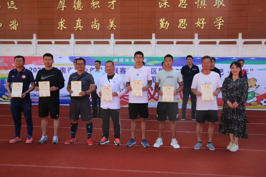 楚雄市足球协会裁判部部长宋斌宣读比赛成绩与名次,出席颁奖仪式的各位领导和嘉宾为参赛队颁奖。