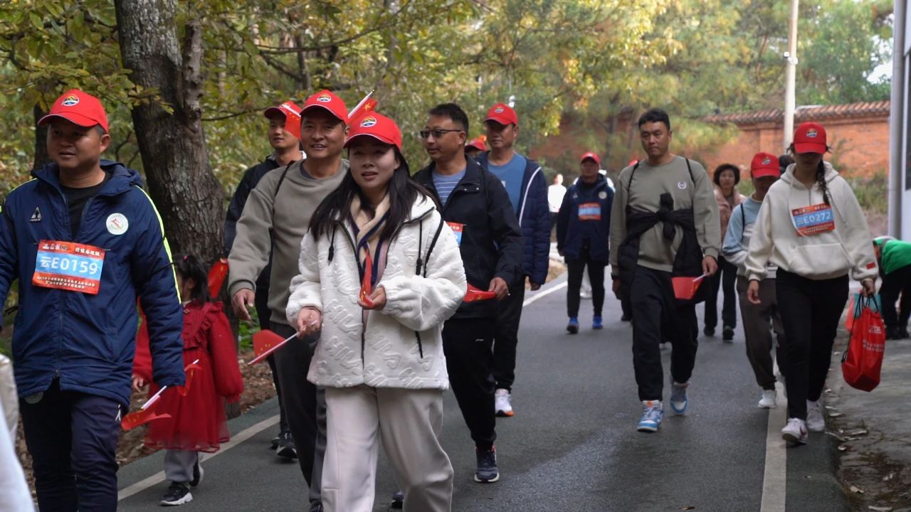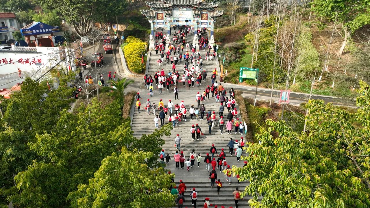 上午9点,活动在欢快激昂的氛围中拉开帷幕。随着发令汽笛鸣响,参与者们如离弦之箭,满怀激情地冲向山顶。峨碌公园,是楚雄八景之一的“峨碌晴岚”所在地,拥有丰富的自然景观和人文景观。5公里的登高路线,巧妙地将自然风光、文化底蕴以及爱国主义教育基地所承载的红色革命历史紧密融合,同时沿途设置了多个拍照打卡点,千余人用合影的方式向祖国深情表白,打造出一场别具一格的红色主题健康活动。