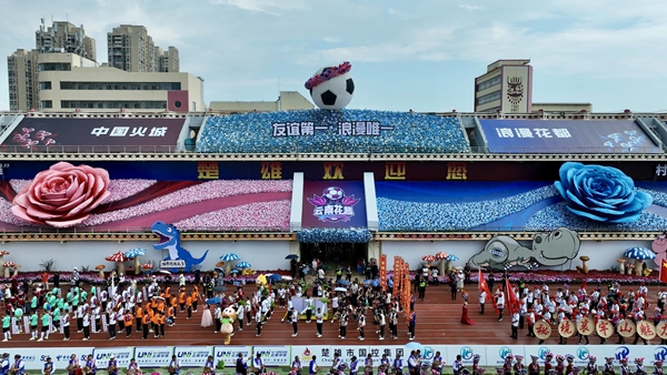 开幕式现场,鲜花方队、云南省各州(市)参赛方队、楚雄州各县(市)参赛方队、非遗展示方队、美食方队依次亮相,集中展示了云南鲜花产业和特色美食,以及各州(市)的产业、民俗、文化等。鲜花方阵芬芳吐艳,让现场洋溢着浪漫的气息;“世界恐龙之乡”“东方人类故乡”“世界野生菌王国”“中国绿孔雀之乡”四张名片方队,尽显楚雄独特的文化魅力;左脚舞方队、非遗展示等方队也各具特色,展示出浓郁的民族风情。开球仪式上,激昂的旋律响彻云霄,漫天花瓣如雨飘落,用鲜花替代烟花的创意,既践行了环保理念,也进一步擦亮了楚雄“浪漫花都”的名片。