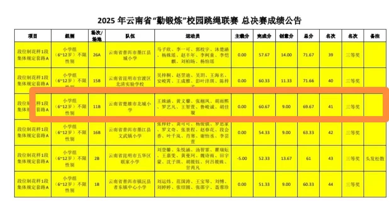 此次赛事中,北城小学参赛队全员发力、全面出击,在集体与个人项目中双线绽放。集体赛场上,规定套路一的整齐划一、10-12岁组十人跳长绳的默契配合、8-10岁组三分钟八字十人长绳的节奏飞扬,每一个跳跃都凝聚着团队的力量,每一次摇绳都传递着协作的信念。