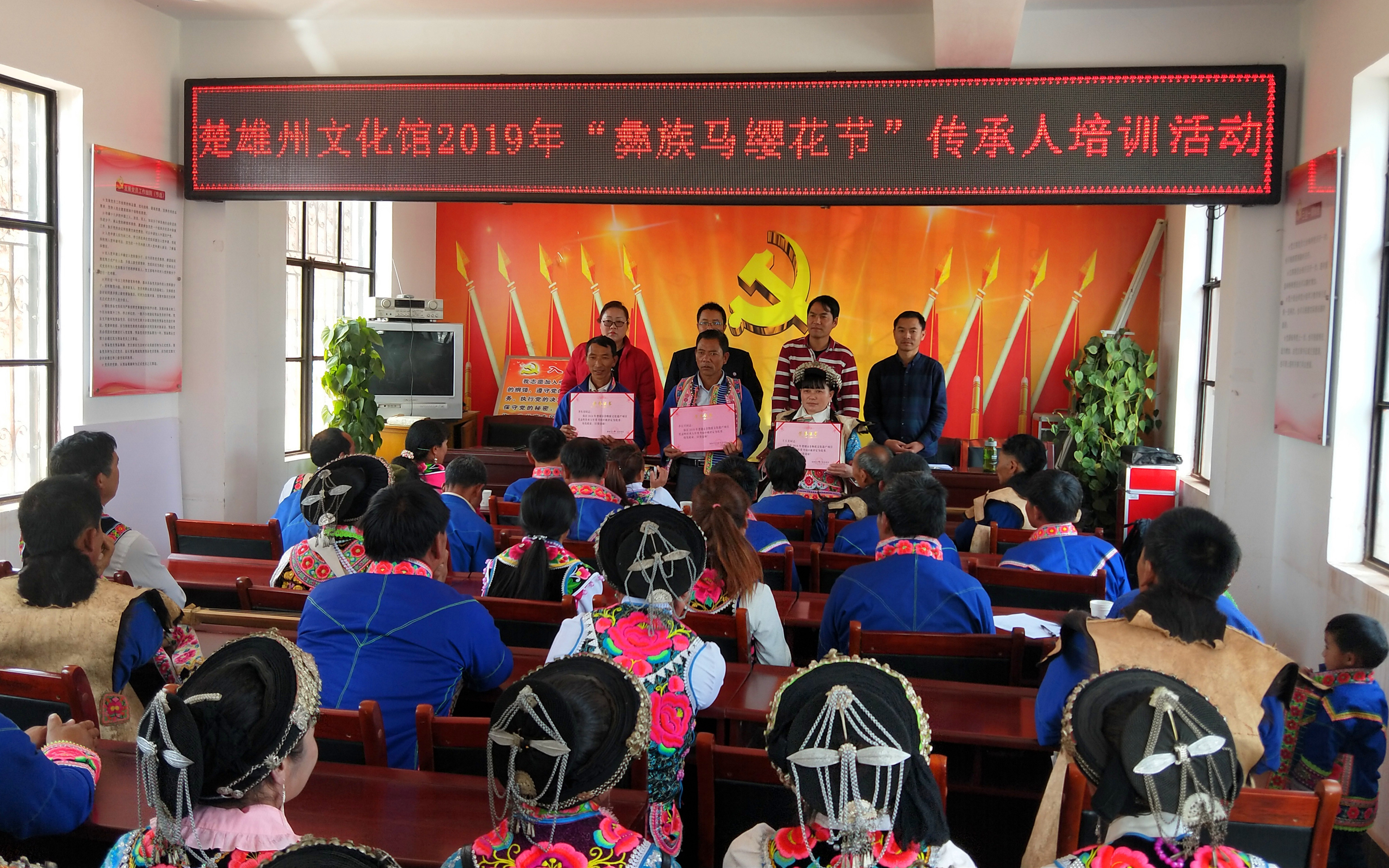 农历二月初八是彝族人民的传统节日“马樱花节”,楚雄市文体广电旅游局在紫溪镇板凳山举办2019年彝族马樱花节暨板凳山彝族传统文化生态保护区项目传承人骨干培训活动,活动由楚雄州非遗中心、楚雄市非遗中心、紫溪镇文化广播电视服务中心共同组织,楚雄州非遗中心主任白爱荣、市传袭所长朱正禄等领导为传承人和文艺骨干进行授课并指导传承技艺,参加培训人员共60多人,活动还表彰了2018年优秀传承人。