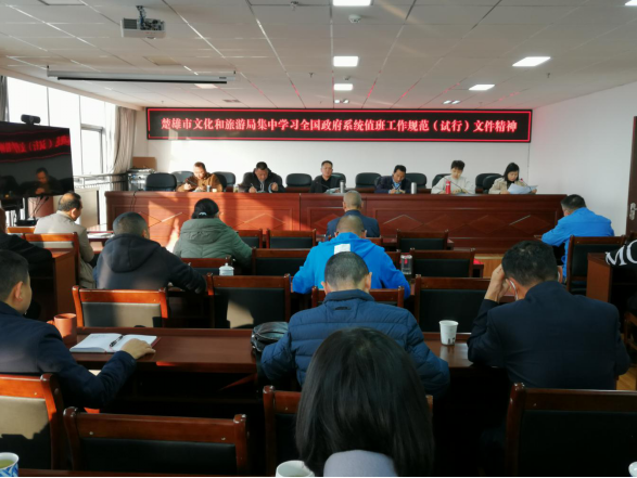 为贯彻落实市政府关于转发《全国政府系统值班工作规范(试行)文件的通知》(楚政办通〔2022〕3号)要求,促进全市文化旅游系统进一步规范值班值守工作,2022年3月7日上午,市文化和旅游局在局九楼会议室召开《全国政府系统值班工作规范(试行)》宣传贯彻集中学习会,局全体领导班子成员、下属单位中层干部和局机关及部分下属单位全体干部职工参加了会议。