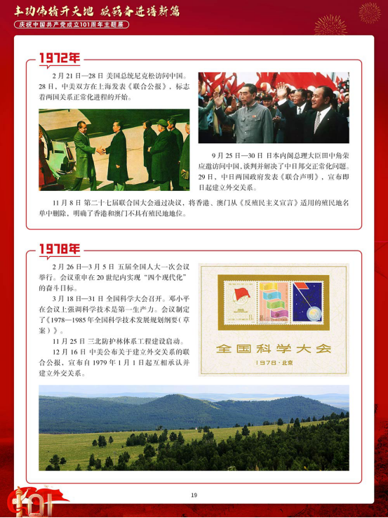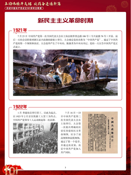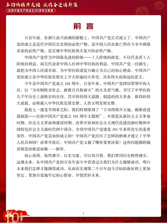 值此七一建党节到来之际,我们特别策划了“丰功伟绩开天地,砥砺奋进谱新篇—庆祝中国共产党成立 101 周年主题展”。本展览从新民主主义革命时期、社会主义革命和建设时期、改革开放和社会主义现代化建设新时期和中国特色社会主义新时代四个部分,介绍中国共产党建党 101 年来所发生的重要事件。中国共产党是如何成立的?中国共产党经历了怎样的磨难才建立了中华人民共和国?改革开放后,中国共产党又做了哪些重要决策?这些问题都将随着展览的推进而被一一解答。