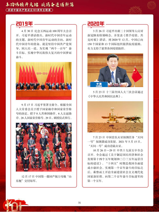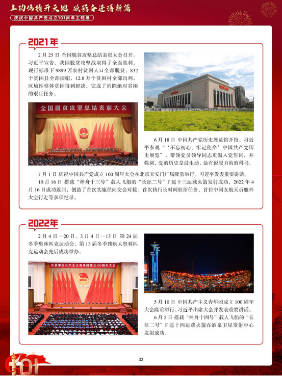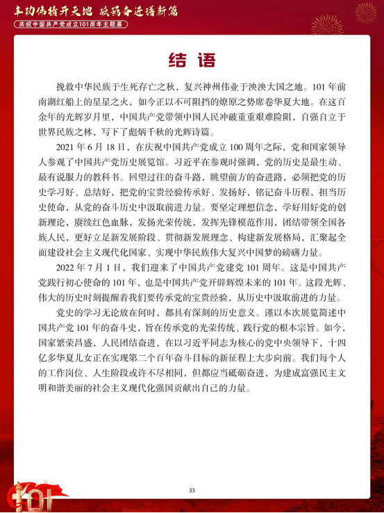 今年是中国共产党成立 101 周年。百余年来,中国共产党团结带领中国人民,以“为有牺牲多壮志,敢教日月换新天”的大无畏气概,书写了中华民族几千年历史上最恢宏的史诗。其开辟的伟大道路、创造的伟大事业、取得的伟大成就,必将载入中华民族发展史册、人类文明发展史册。