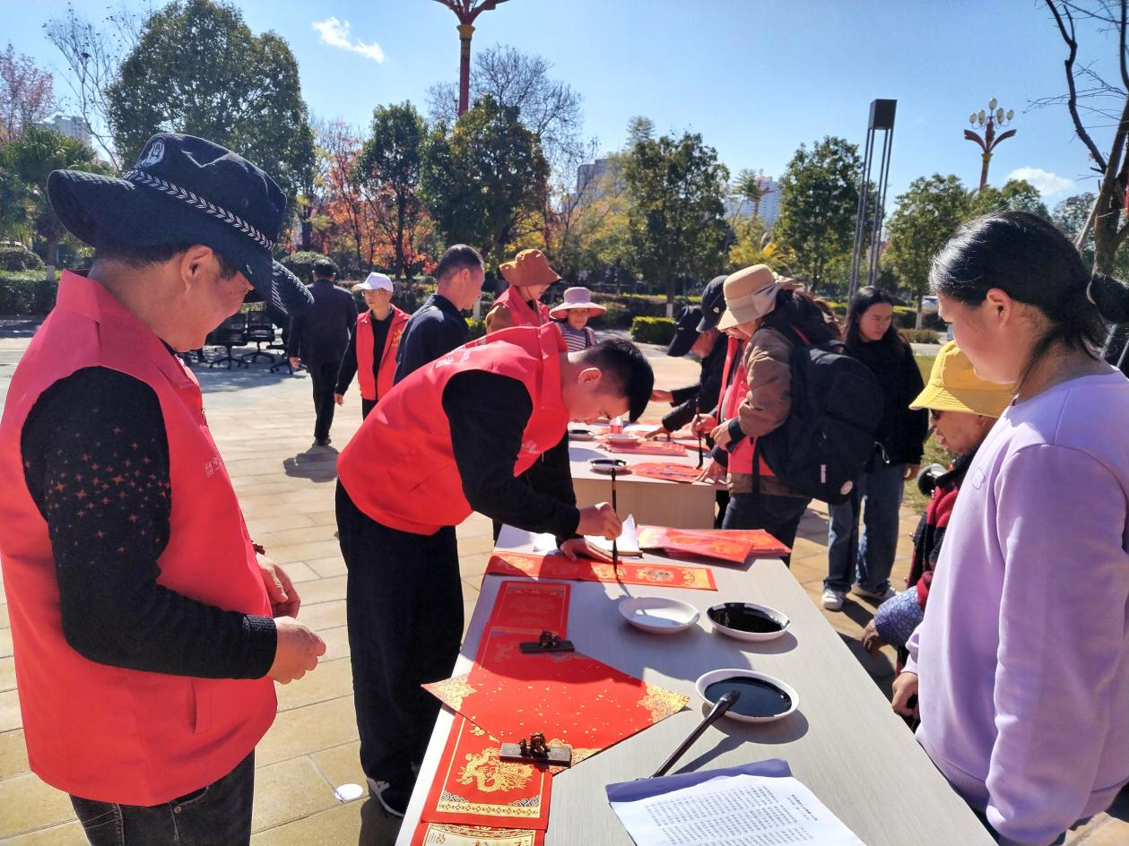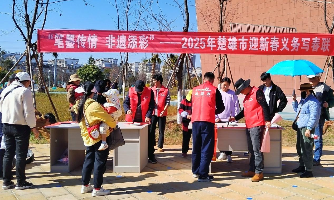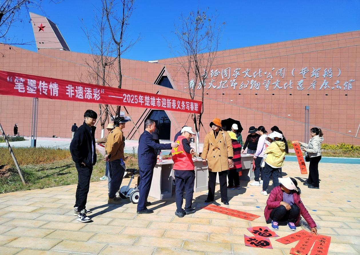 为了迎接2025年的新春佳节,弘扬中华优秀传统文化,营造喜庆祥和的节日氛围,2025年1月1日13:00至17:00,由楚雄市文化和旅游局、楚雄市文化艺术联合党支部、楚雄市文化馆和长征国家文化公园(楚雄段)彝族火把节非物质文化遗产展示馆携手组织,在楚雄市长征国家文化公园(楚雄段)彝族火把节非物质文化遗产展示馆广场举办了“笔墨传情,非遗添彩”——2025年楚雄市迎新春义务写春联活动。