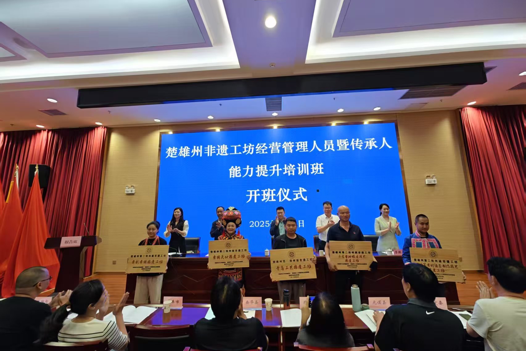州委宣传部、州文旅局、州农业农村局相关领导出席开班仪式并强调:非遗是楚雄州文化根脉与精神标识,非遗工坊作为“活态传承”的重要载体,承载着文化保护与群众就业的双重使命,要以此次培训为契机,构建非遗传承创新矩阵,推动非遗保护传承与“强州府”建设同频共振,让传统文化成为驱动高质量发展的新引擎。
