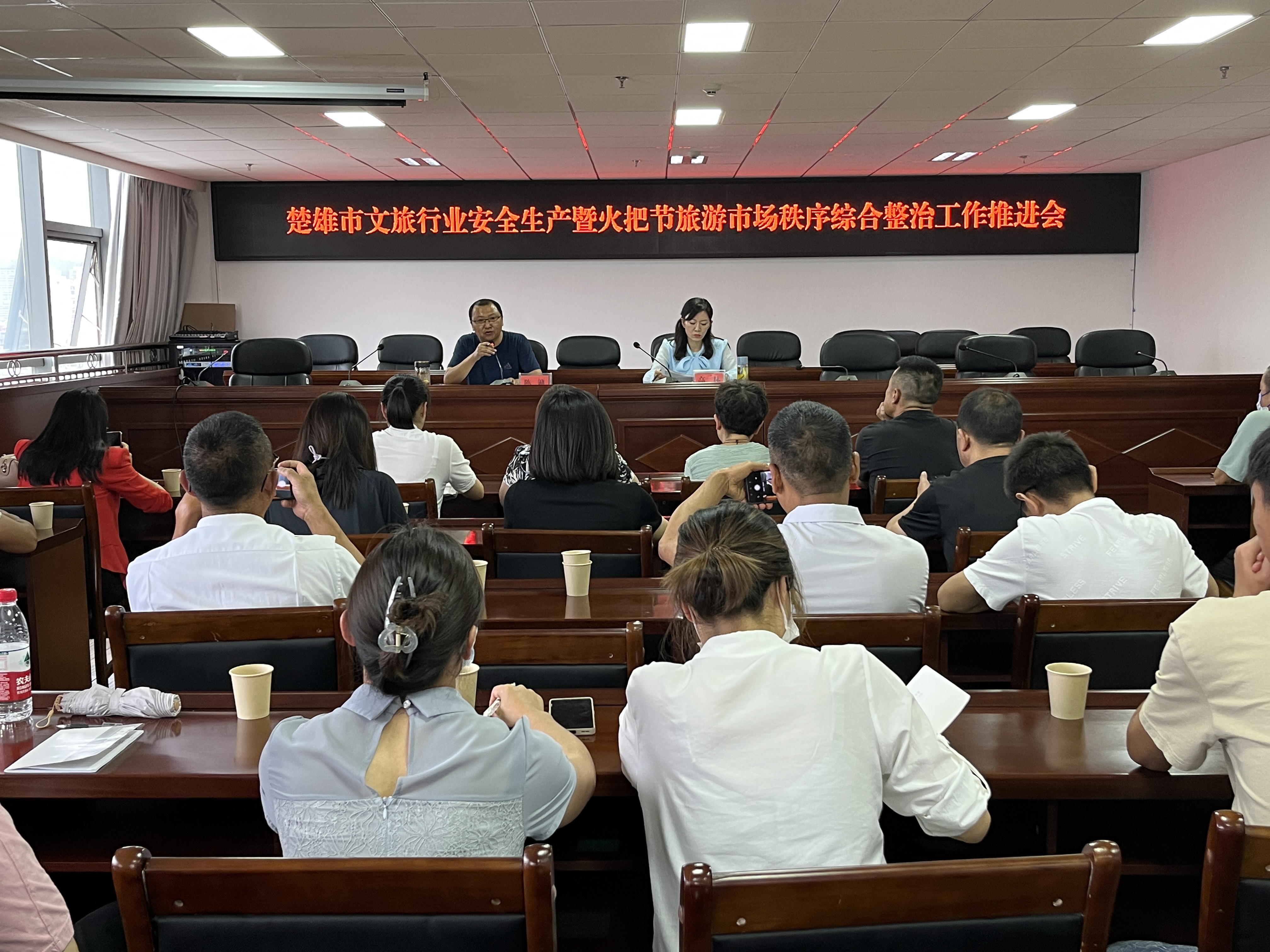 2023年6月19日下午,楚雄市文化旅游行业安全生产暨火把节市场秩序综合整治工作推进会在楚雄市文化和旅游局九楼会议室召开,局党组书记高林、副局长陈镛出席会议并讲话,行业管理科、市文管所全体干部职工及市辖84家文化旅游行业要素单位负责人参加会议。