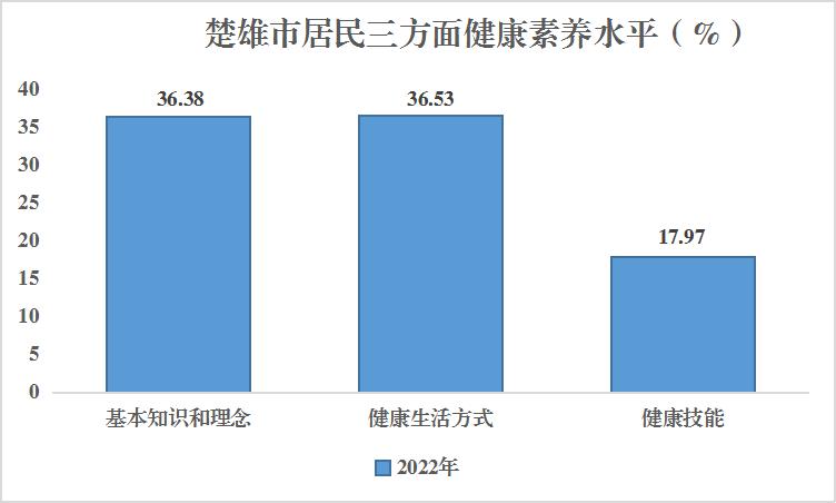 2022年楚雄市居民三个方面健康素养水平:基本知识和理念素养水平为36.38%;健康生活方式与行为素养水平36.53%;健康技能素养水平为17.97%。三个方面的健康素养水平有明显的差异,说明居民对相关健康技能的掌握仍需加强。