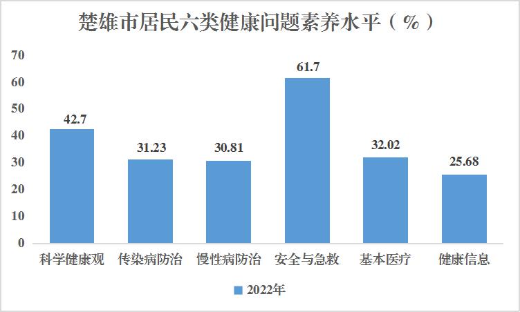 2022年楚雄市居民六类健康问题素养水平由高到低依次为:安全与急救素养61.70%、科学健康观素养42.70%、基本医疗素养32.02%、传染病防治素养31.23%、慢性病防治素养30.81%、健康信息素养25.68%。