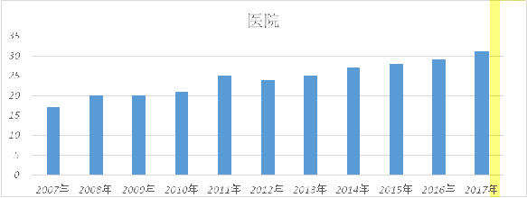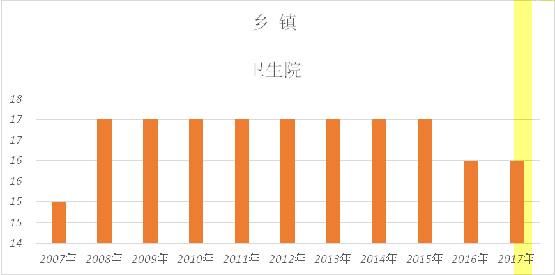 1.医疗卫生机构数:2017年末,全市医疗卫生机构总数388个,同比下降4.38%。其中:医院31个,同比增加6.90%;基层医疗卫生机构347个,同比减少5.19%;专业公共卫生机构10个(见图一、图二、图三、表一)。按医院等级分,三级医院3个(其中三级甲等医院2个、三级乙等医院1个),二级医院18个,一级医院10个;按机构类别分,综合医院15个,中医医院4个,中西医结合医院1个,专科医院11个。按经济类型分,公立医院9家,占全市医院数之比为29.03%,同比减少1家;民营医院22家,占全市医院数之比为70.97%,同比增加3家。基层医疗卫生机构中,社区卫生服务中心(站)16个,卫生院16个,村卫生室142个,诊所157个,门诊部16个。