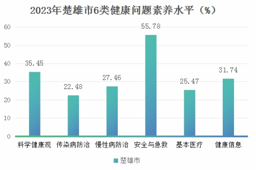 从科学健康观、传染病防治、慢性病防治、安全与急救、基本医疗、健康信息六类健康问题素养水平来看,楚雄市2023年居民安全与急救素养和科学健康观素养相对较高,分别为55.78%和35.45%,健康信息素养和慢性病防治素养水平次之,分别为31.74%和27.46%。素养水平靠后的是基本医疗素养和传染病防治素养水平,分别是25.47%和22.48%。